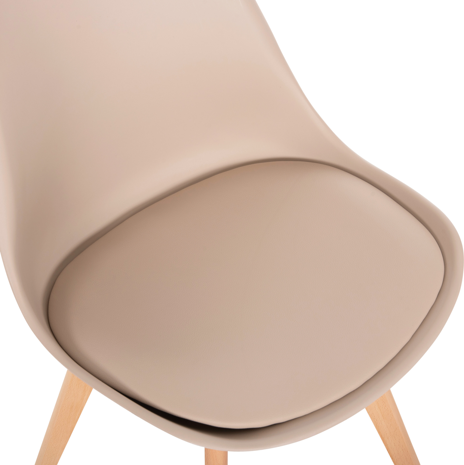 Ένα ορθογώνιο τραπέζι με πόδια από MDF σε SONAMA χρώμα και γυάλινη επιφάνεια, και 4 καρέκλες με πόδια οξιάς σε ΦΥΣΙΚΟ χρώμα και κάθισμα πολυπροπυλενίου με μαξιλαράκι από PU leather σε χρώμα ΚΑΠΟΥΤΣΙΝΟ.