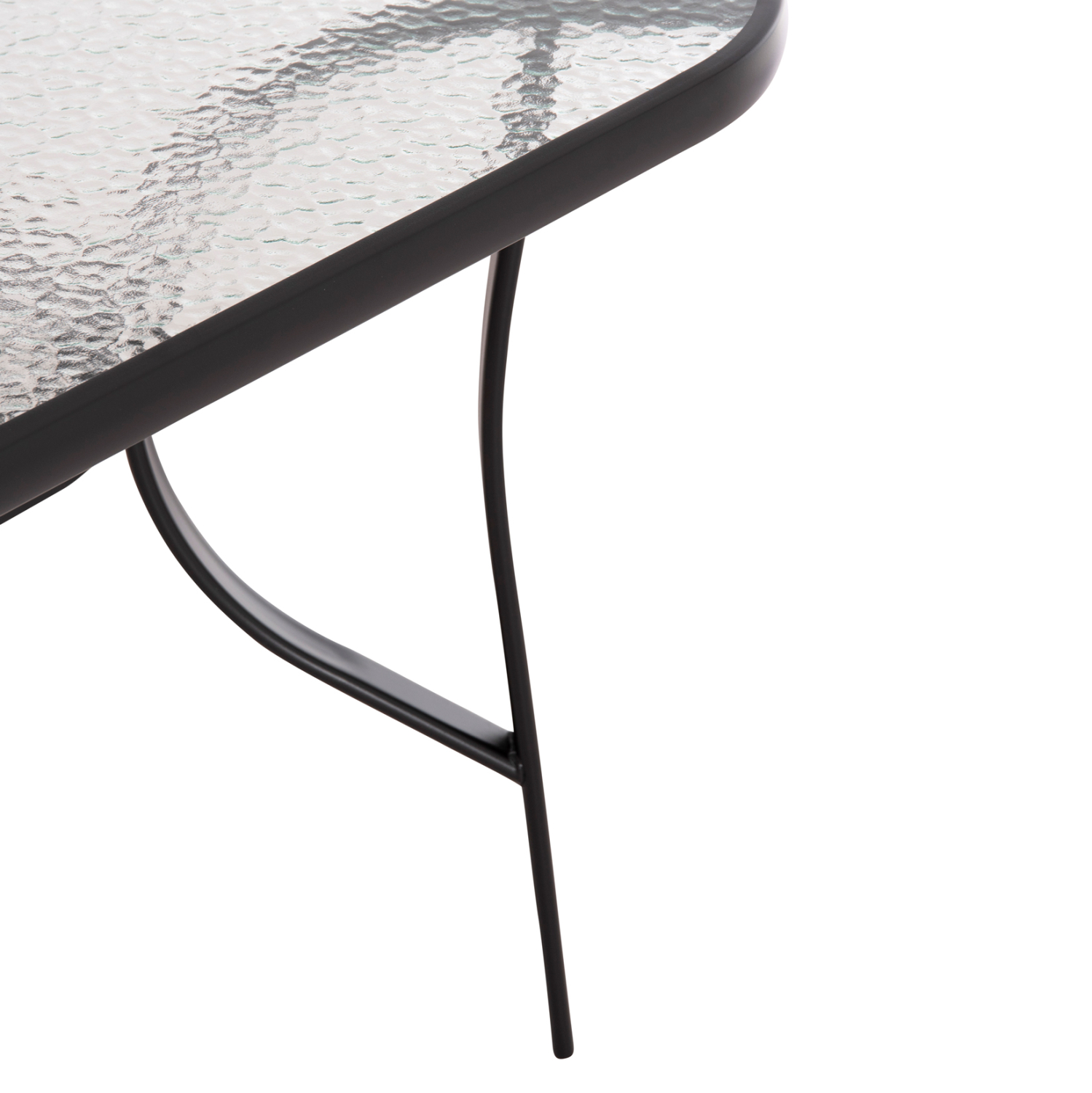 Αυτό το Σετ τραπεζαρίας εξωτερικού χώρου διαθέτει τραπέζι με ΜΑΥΡΟ μεταλλικό σκελετό και γυάλινη θολή ΕΝΙΣΧΥΜΕΝΗ επιφάνεια, και 4 μαύρες μεταλλικές πολυθρόνες (στοιβαζόμενες) με κάθισμα & πλάτη από textilene ύφασμα σε ΜΑΥΡΟ, με ξύλινη επένδυση στα μπράτσα.