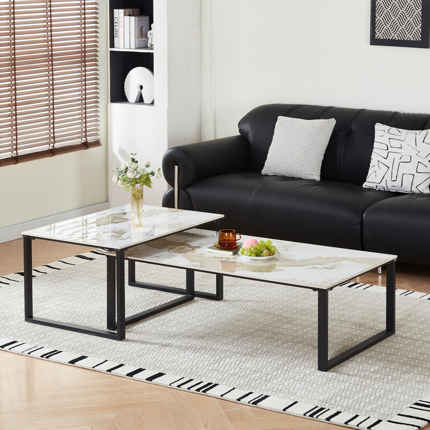 Το σετ τραπεζιών σαλονιού FB918365.01 αποτελεί μια σύγχρονη και ιδιαίτερα κομψή επιλογή για μοντέρνους χώρους καθιστικού. Ο συνδυασμός μαύρων μεταλλικών βάσεων με επιφάνειες από sintered stone στο εντυπωσιακό χρωματικό μοτίβο PANDORA προσδίδει αρχιτεκτονικό χαρακτήρα, υψηλή αντοχή και διαχρονική αισθητική.