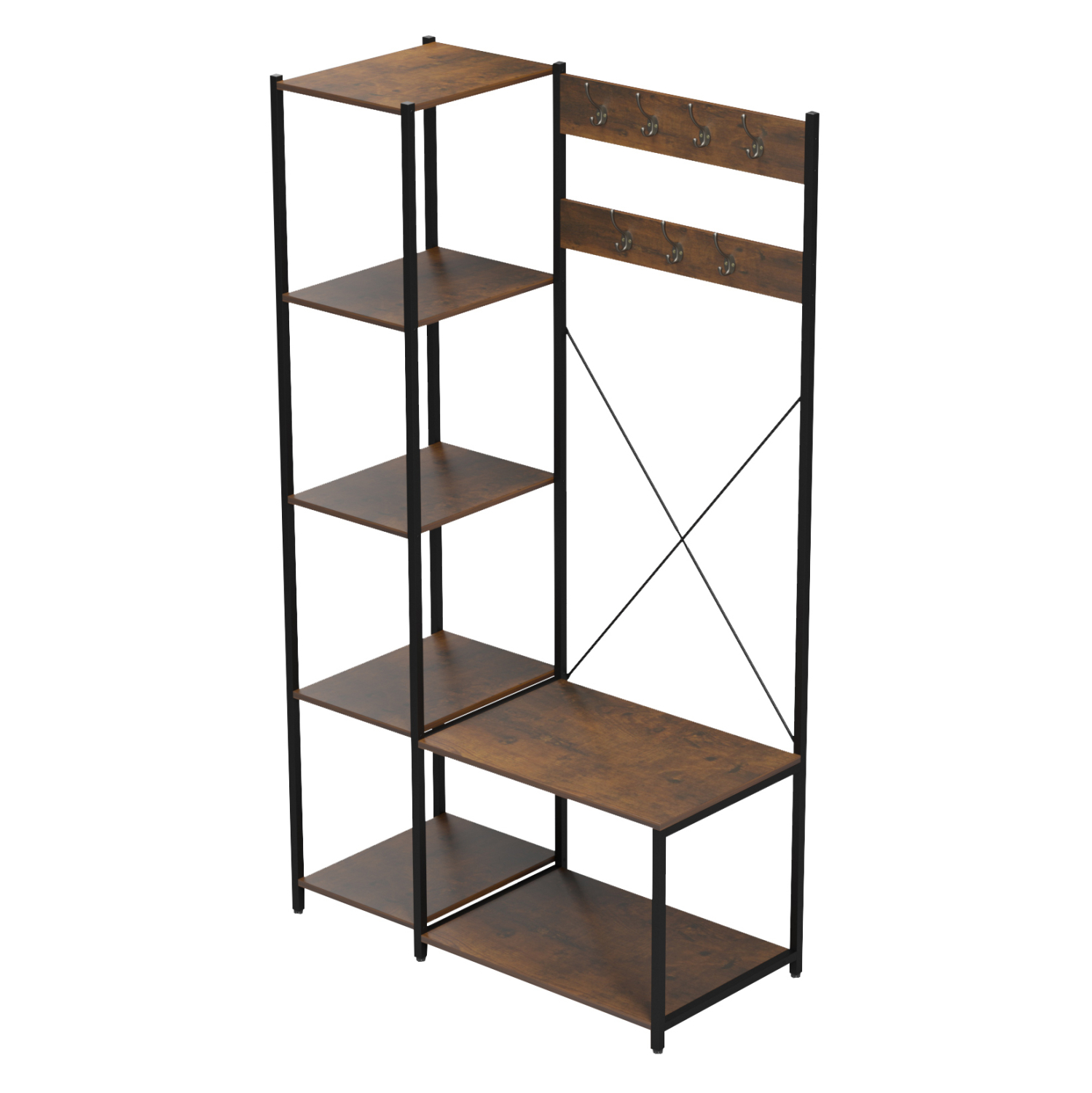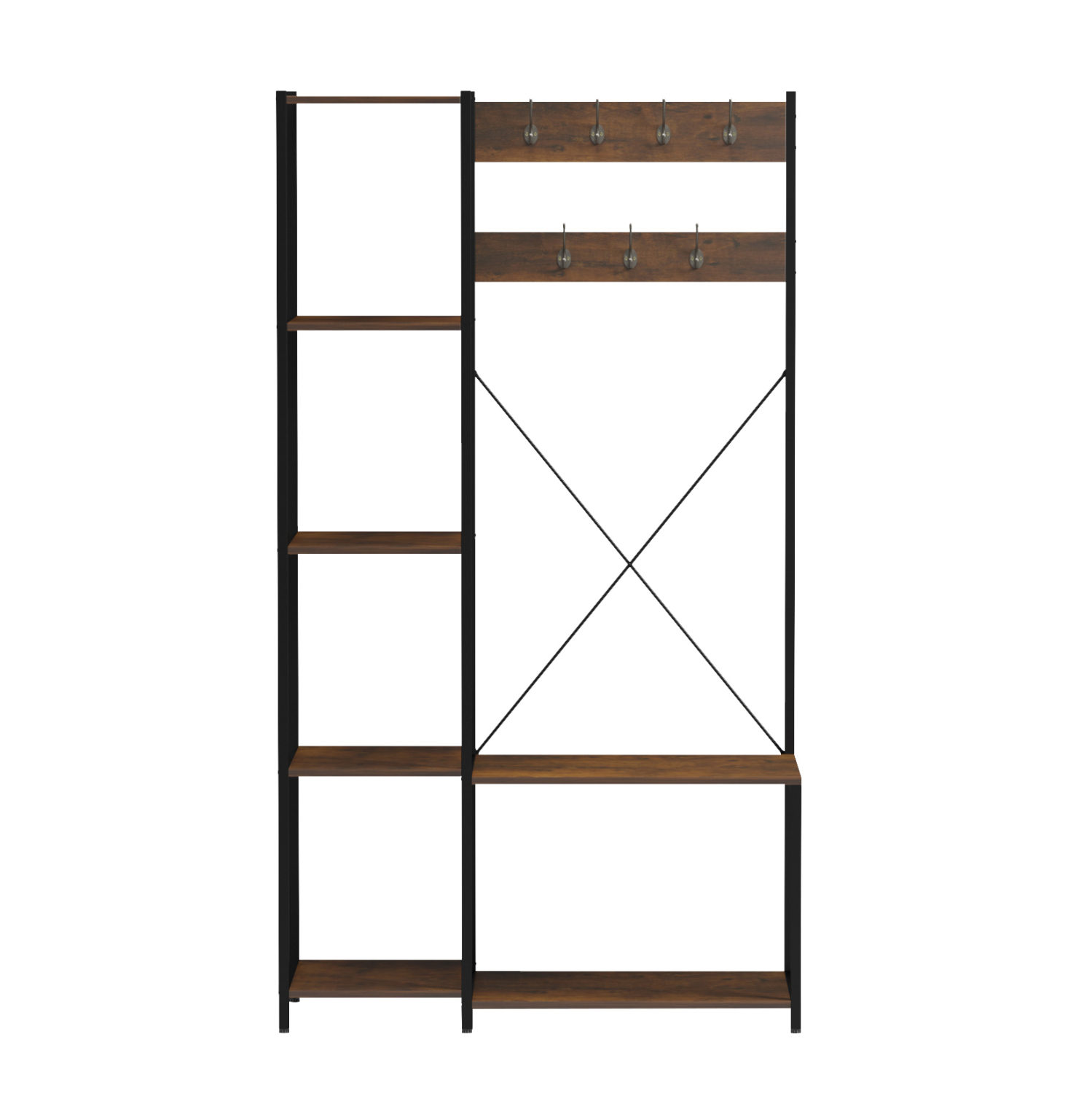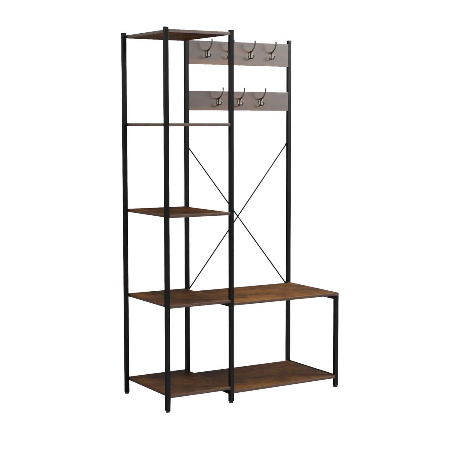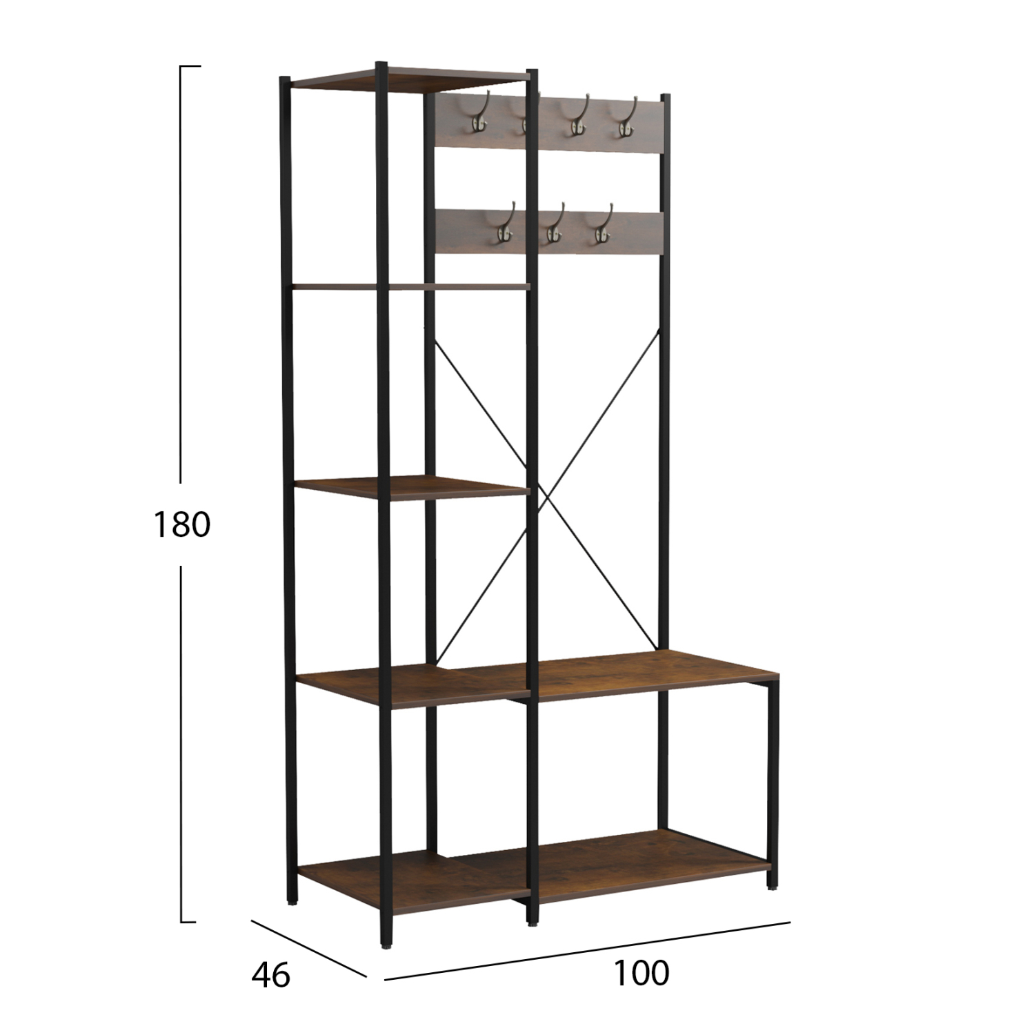 Το επιδαπέδιο έπιπλο εισόδου σε στυλ ανοιχτής ντουλάπας FB918083 είναι ψηλό και συνδυάζει πρακτικότητα και industrial στυλ. Διαθέτει 4 τετράγωνα ραφάκια στην μια πλευρά (+1 την οροφή), ενώ στην άλλη υπάρχει κρεμάστρα με 7 διπλούς γάντζους, και 2 παταράκια στο κάτω μέρος για παπούτσια. Ο σκελετός είναι μεταλλικός σε ΜΑΥΡΟ χρώμα, ενώ τα ραφάκια είναι από μελαμίνη σε χρωματισμό ΚΑΦΕ ρουστίκ.