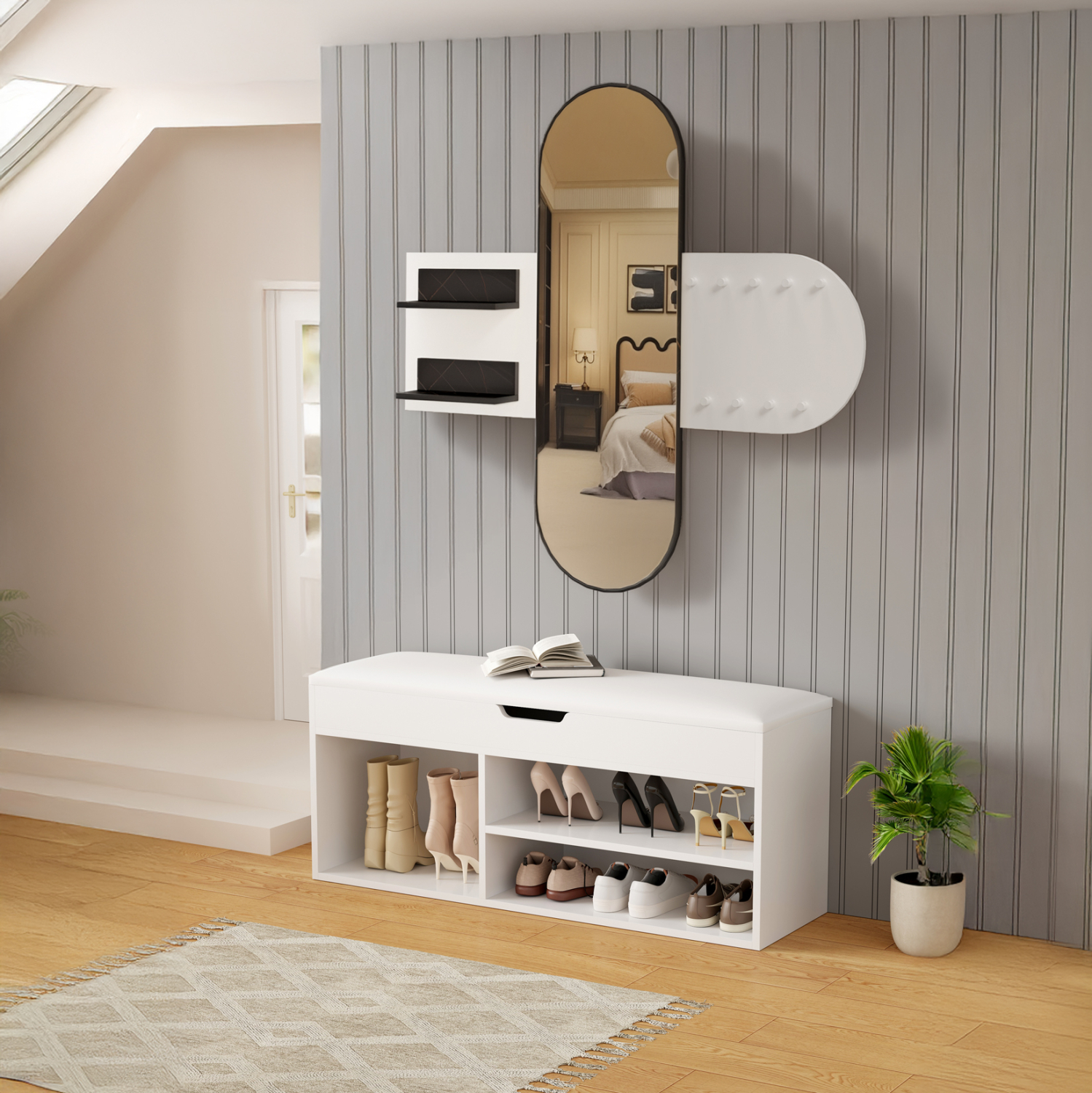•Μία παπουτσοθήκη σε ΛΕΥΚΟ χρώμα με κάθισμα επενδυμένο με PU δέρμα. Ο χώρος αποθήκευσης είναι ανοιχτός με 2 επίπεδα στην μια πλευρά και έναν μεγαλύτερο στην άλλη για ψηλότερα παπούτσια, ενώ κάτω από το κάθισμα που ανασηκώνεται υπάρχει ακόμα ένας, πιο ρηχός, χώρος αποθήκευσης αντικειμένων.