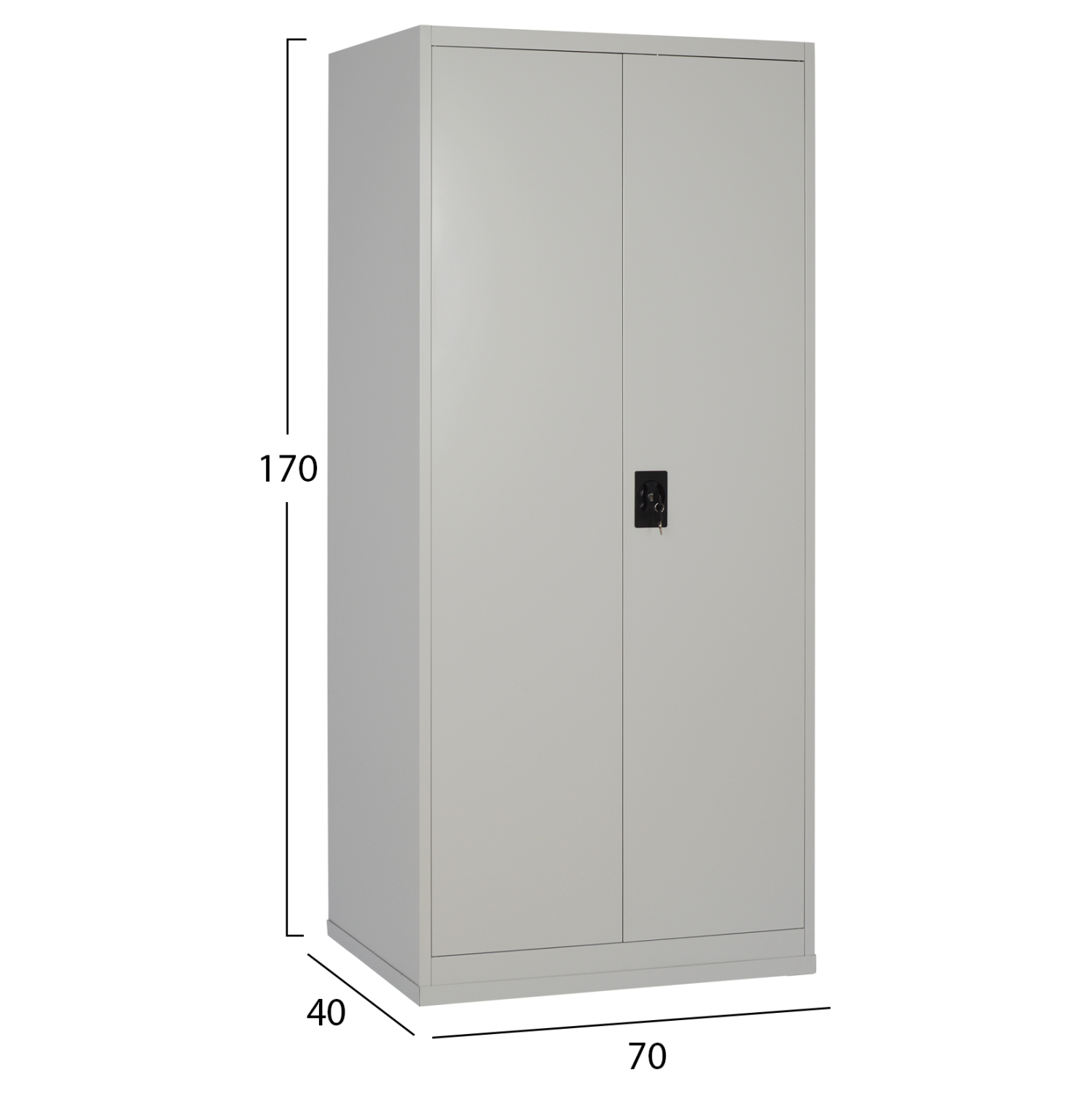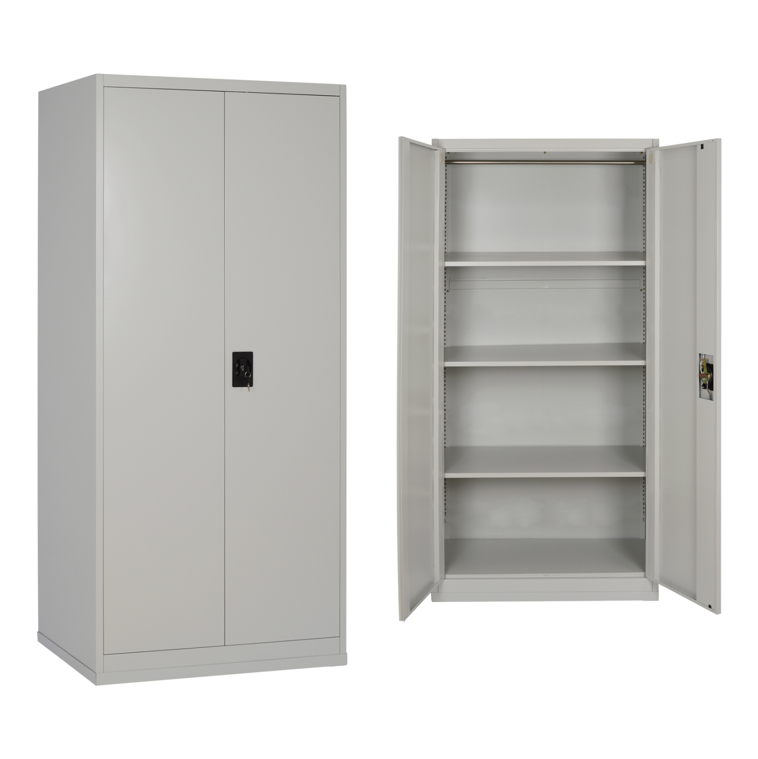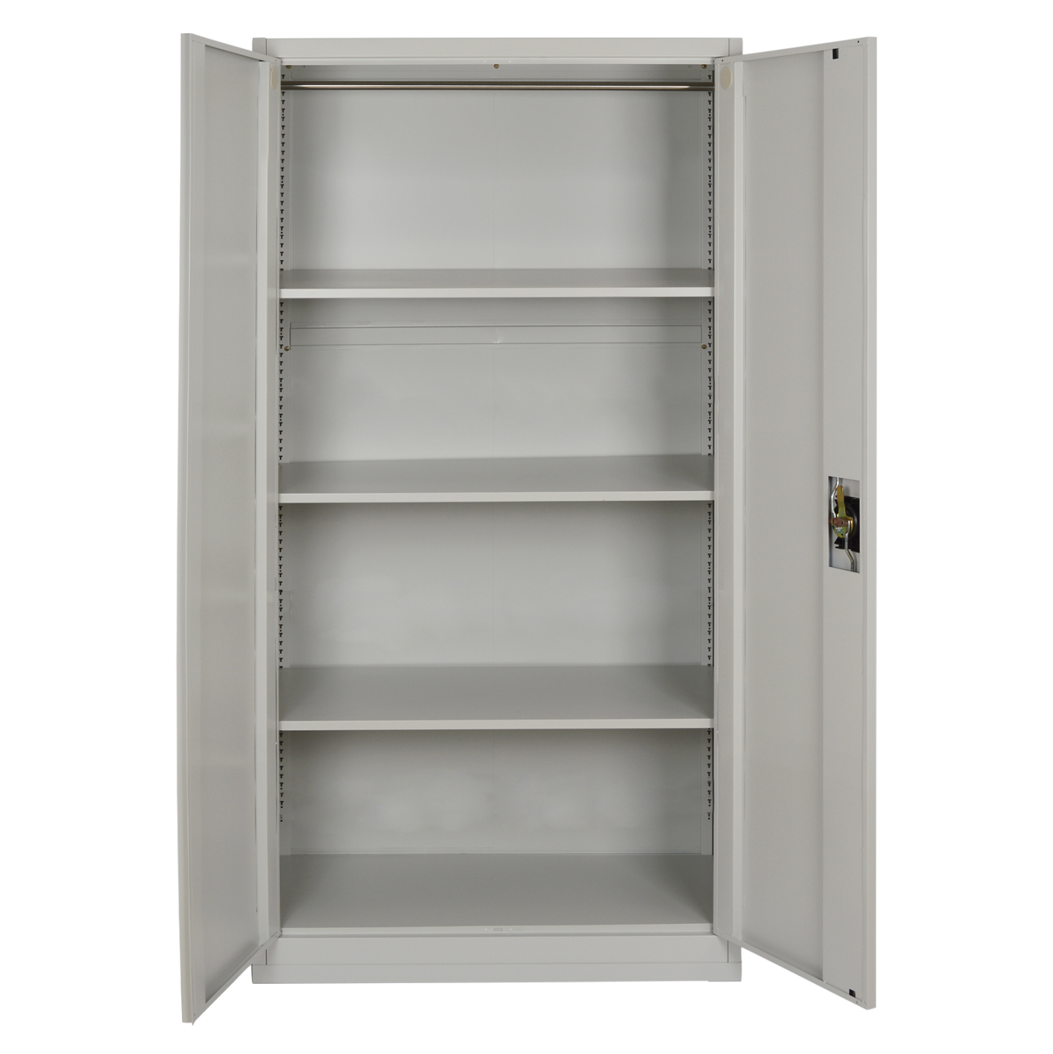 Η ντουλάπα διαθέτει δύο πόρτες με κλειδαριά για ασφαλή φύλαξη αντικειμένων και τρία ρυθμιζόμενα ράφια, ώστε να προσαρμόζεται εύκολα στις ανάγκες σας — ιδανική για εργαλεία, φακέλους, ρούχα ή εξοπλισμό.
