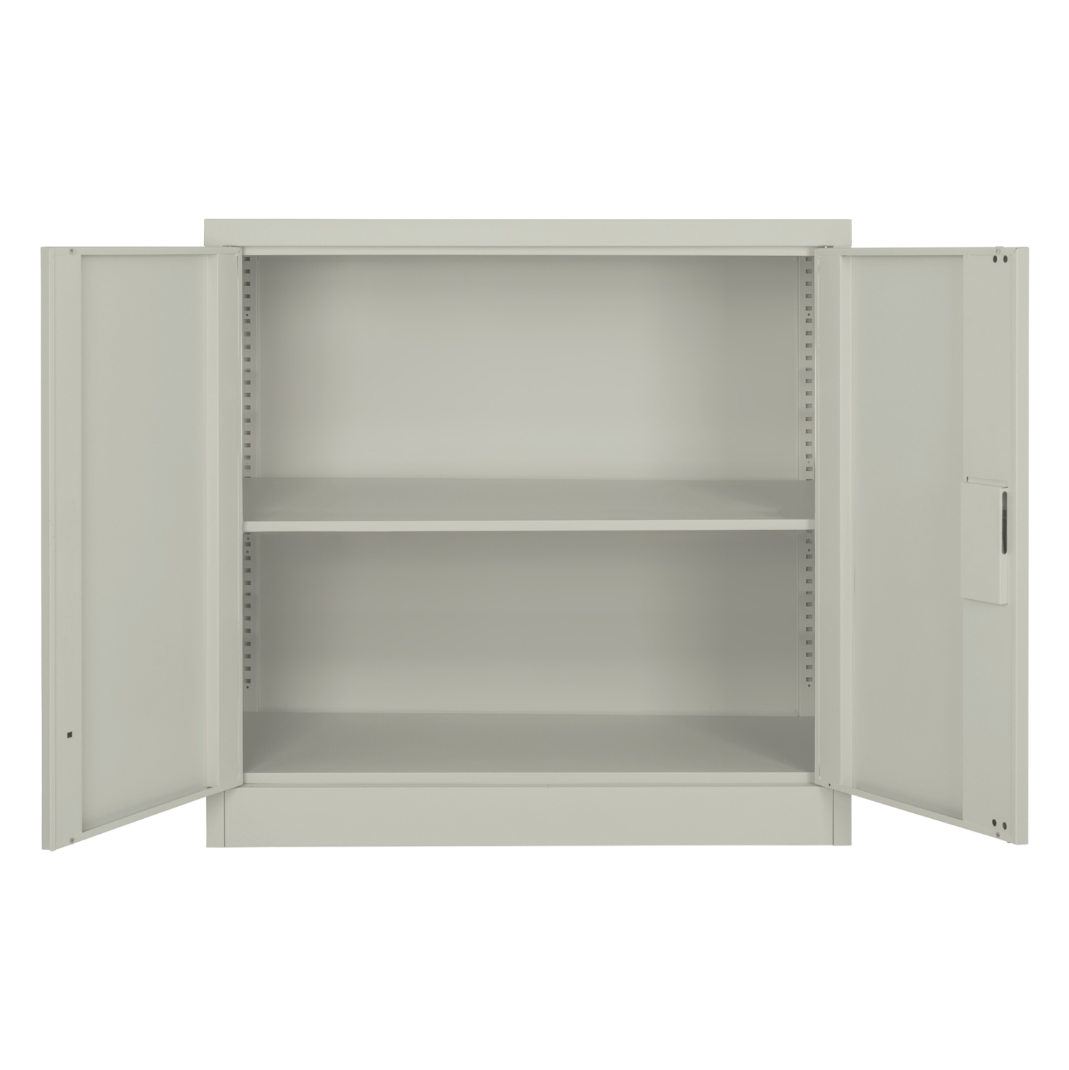 Η FB95960.11 είναι μια πρακτικότατη κοντή μεταλλική ντουλάπα που έχει φτιαχτεί με γνώμονα την χωρητικότητα για το μέγεθός της και την ανθεκτικότητα. Είναι δίφυλλη με τις δύο πόρτες να κλείνουν ακριβώς στην μέση της κατασκευής, ενώ το εσωτερικό είναι ένας ενιαίος χώρος χωρίς κάθετα χωρίσματα. Διαθέτει 1 ράφι που δημιουργεί 2 αποθηκευτικούς χώρους. Οι πόρτες διαθέτουν κλειδαριά που κλειδώνει με κλειδί, ενώ το χρώμα της ντουλάπας είναι πολύ ανοιχτό γκρι.