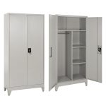 Η FB911981 είναι μια πρακτικότατη μεταλλική ντουλάπα με πόδια, που έχει φτιαχτεί με γνώμονα την χωρητικότητα και την ανθεκτικότητα. Είναι δίφυλλη με τις δύο πόρτες να κλείνουν ακριβώς στην μέση της κατασκευής, ενώ το εσωτερικό είναι χωρισμένο σε 3 κύριους χώρους με μεταλλικό χώρισμα σε σχήμα Τ. Το επάνω μέρος είναι ενιαίο σαν παταράκι, ενώ η μία πλευρά διαθέτει μεταλλική μπάρα για κρέμαση αντικειμένων και η άλλη διαθέτει 2 ράφια που δημιουργούν 3 επίπεδα αποθήκευσης. Οι πόρτες διαθέτουν κλειδαριά που κλειδώνει με κλειδί, ενώ το χρώμα της ντουλάπας είναι πολύ ανοιχτό γκρι.