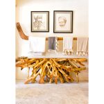 FB99369—Κονσόλα σε ακανόνιστο μακρόστενο σχήμα επιφάνειας. Το εντυπωσιακό σε αυτή την κονσόλα είναι ότι αντί για παραδοσιακά πόδια στηρίζεται σε ένα κομμάτι από την κανονική ρίζα του δέντρου. Το αισθητικό αποτέλεσμα είναι όμορφο και είναι αναπόφευκτο να τραβήξει την προσοχή όλων, σε οποιοδήποτε χώρο κι αν τοποθετηθεί! Αποτελεί την επιτομή της ρουστίκ διακόσμησης για τον χώρο που επιθυμείτε. Τι είναι όμως η κονσόλα; Η κονσόλα είναι ένα κομψό, γραφικό, συμπαγές έπιπλο που μπορεί να τοποθετηθεί σε σχεδόν οποιοδήποτε δωμάτιο- κουζίνα, διάδρομο, κρεβατοκάμαρα, παιδικό δωμάτιο, σαλόνι, dressing room, γραφείο, ακόμα και στο μπάνιο. Με αυτό, ο σχεδιασμός του χώρου γίνεται εκλεπτυσμένος, κομψός, πλήρως σκεπτόμενος. Η κονσόλα στο εσωτερικό χρησιμοποιείται τόσο ως μέρος ενός σετ με πολλά στοιχεία, όσο και ανεξάρτητα και επιλέγεται για τον γενικό σχεδιασμό του δωματίου.