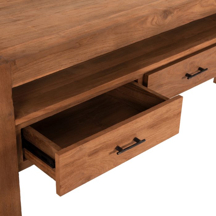 FB99556—Κονσόλα από ξύλο ΤΕΑΚ σε κανονικό μακρόστενο ορθογώνιο σχήμα επιφάνειας. Στηρίζεται σε 4 στιβαρά πόδια και διαθέτει 3 συρτάρια σε σειρά. Πάνω από τα συρτάρια διαθέτει και επιπλέον χώρο τοποθέτησης αντικειμένων. Το ΦΥΣΙΚΟ χρώμα όλου του επίπλου προσδίδει μια ακαταμάχητη εικόνα που θα αποτελέσει το σημείο αναφοράς οπουδήποτε κι αν τοποθετηθεί η κονσόλα! Αποτελεί την επιτομή της ρουστίκ διακόσμησης σε λιτή κι απέριττη υλοποίηση, για τον χώρο που επιθυμείτε. Τι είναι όμως η κονσόλα; Η κονσόλα είναι ένα κομψό, γραφικό, συμπαγές έπιπλο που μπορεί να τοποθετηθεί σε σχεδόν οποιοδήποτε δωμάτιο- κουζίνα, διάδρομο, κρεβατοκάμαρα, παιδικό δωμάτιο, σαλόνι, dressing room, γραφείο, ακόμα και στο μπάνιο. Με αυτό, ο σχεδιασμός του χώρου γίνεται εκλεπτυσμένος, κομψός, πλήρως σκεπτόμενος. Η κονσόλα στο εσωτερικό χρησιμοποιείται τόσο ως μέρος ενός σετ με πολλά στοιχεία, όσο και ανεξάρτητα και επιλέγεται για τον γενικό σχεδιασμό του δωματίου.