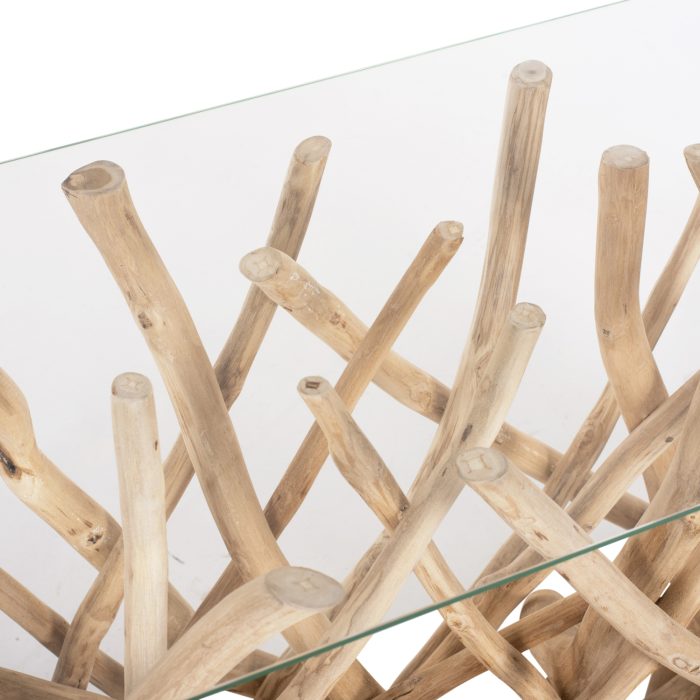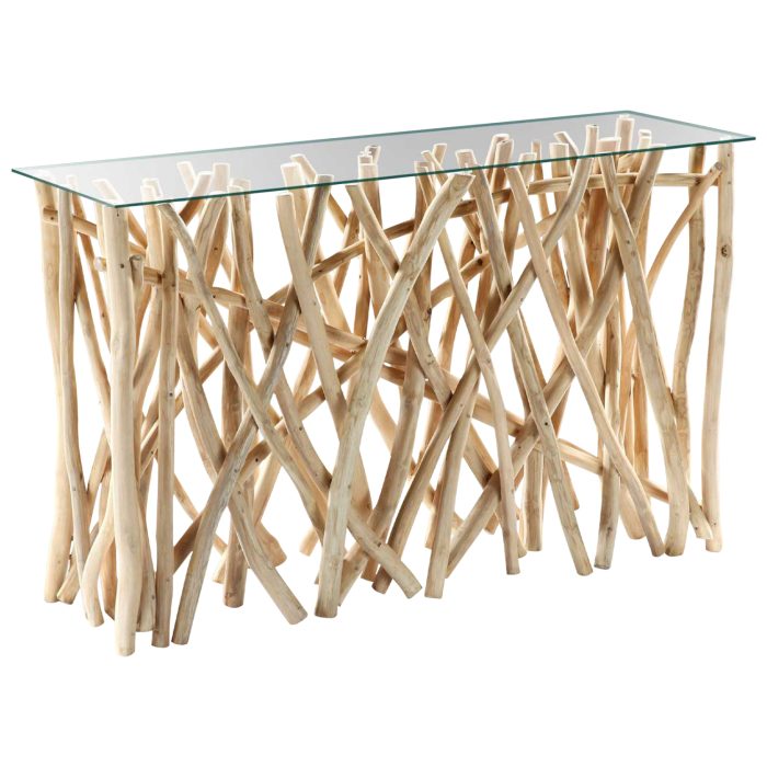 FB99373—Κονσόλα σε κανονικό ορθογώνιο σχήμα επιφάνειας από γυαλί, με σώμα από κλαδιά του δέντρου ΤΕΑΚ αντί για παραδοσιακά πόδια. Το αισθητικό αποτέλεσμα είναι όμορφο και είναι αναπόφευκτο να τραβήξει την προσοχή όλων, σε οποιοδήποτε χώρο κι αν τοποθετηθεί! Αποτελεί την επιτομή της μοντέρνας ρουστίκ διακόσμησης για τον χώρο που επιθυμείτε. Τι είναι όμως η κονσόλα; Η κονσόλα είναι ένα κομψό, γραφικό, συμπαγές έπιπλο που μπορεί να τοποθετηθεί σε σχεδόν οποιοδήποτε δωμάτιο- κουζίνα, διάδρομο, κρεβατοκάμαρα, παιδικό δωμάτιο, σαλόνι, dressing room, γραφείο, ακόμα και στο μπάνιο. Με αυτό, ο σχεδιασμός του χώρου γίνεται εκλεπτυσμένος, κομψός, πλήρως σκεπτόμενος. Η κονσόλα στο εσωτερικό χρησιμοποιείται τόσο ως μέρος ενός σετ με πολλά στοιχεία, όσο και ανεξάρτητα και επιλέγεται για τον γενικό σχεδιασμό του δωματίου.