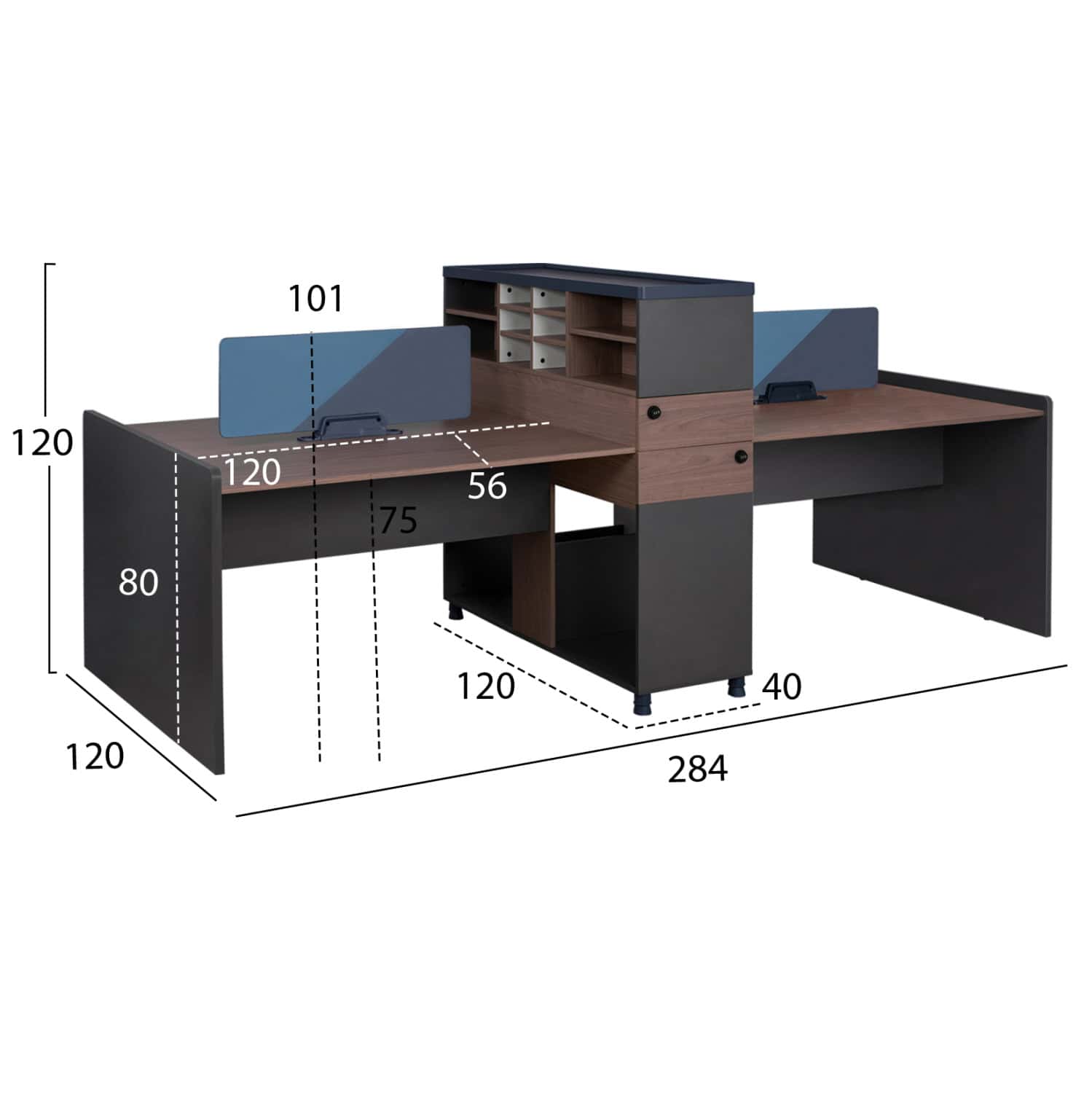 Γραφείο workstation διπλό με χώρισμα, κατασκευασμένο από μελαμίνη υψηλής ποιότητας, σε γκρι και καρυδί απόχρωση και πόδια αλουμινίου σε σκούρο μπλε χρώμα.
