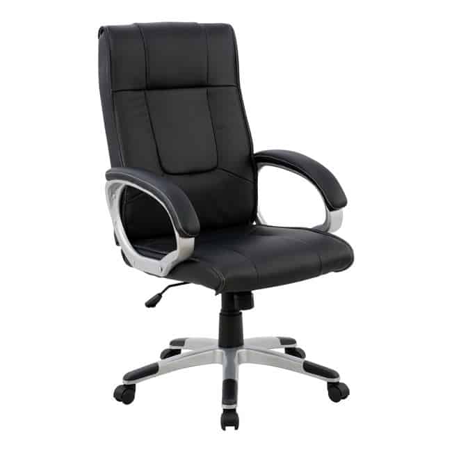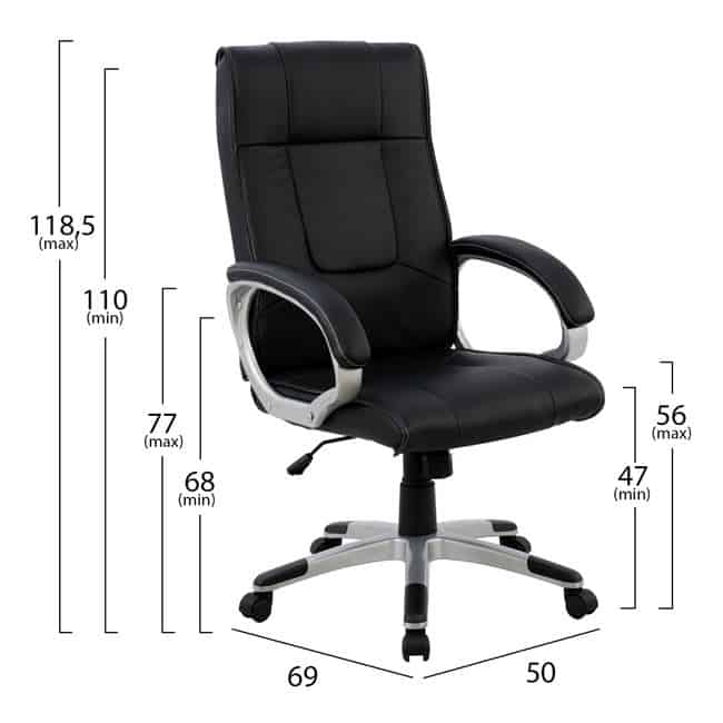 Διευθυντική καρέκλα γραφείου σε μαύρο χρώμα. Μια «πλούσια» καρέκλα γραφείου με ψηλά μπράτσα με κλίση και επενδυμένα με μια λεπτή στρώση αφρολέξ σε PU δέρμα. Η πλάτη είναι ψηλή με πλούσια στρώση από αφρώδη υλικά για άνεση κατά την χρήση και υποστηρίζει ολόκληρο τον κορμό σας, ενώ είναι επενδυμένη με υψηλής ποιότητας PU δέρμα , όπως επίσης και το φαρδύ και αναπαυτικό κάθισμα με την αναπαυτική επιφάνεια. Η βάση είναι ασημί σε σχήμα «αστέρι» με μαύρες λεπτομέρειες στο τελείωμα.