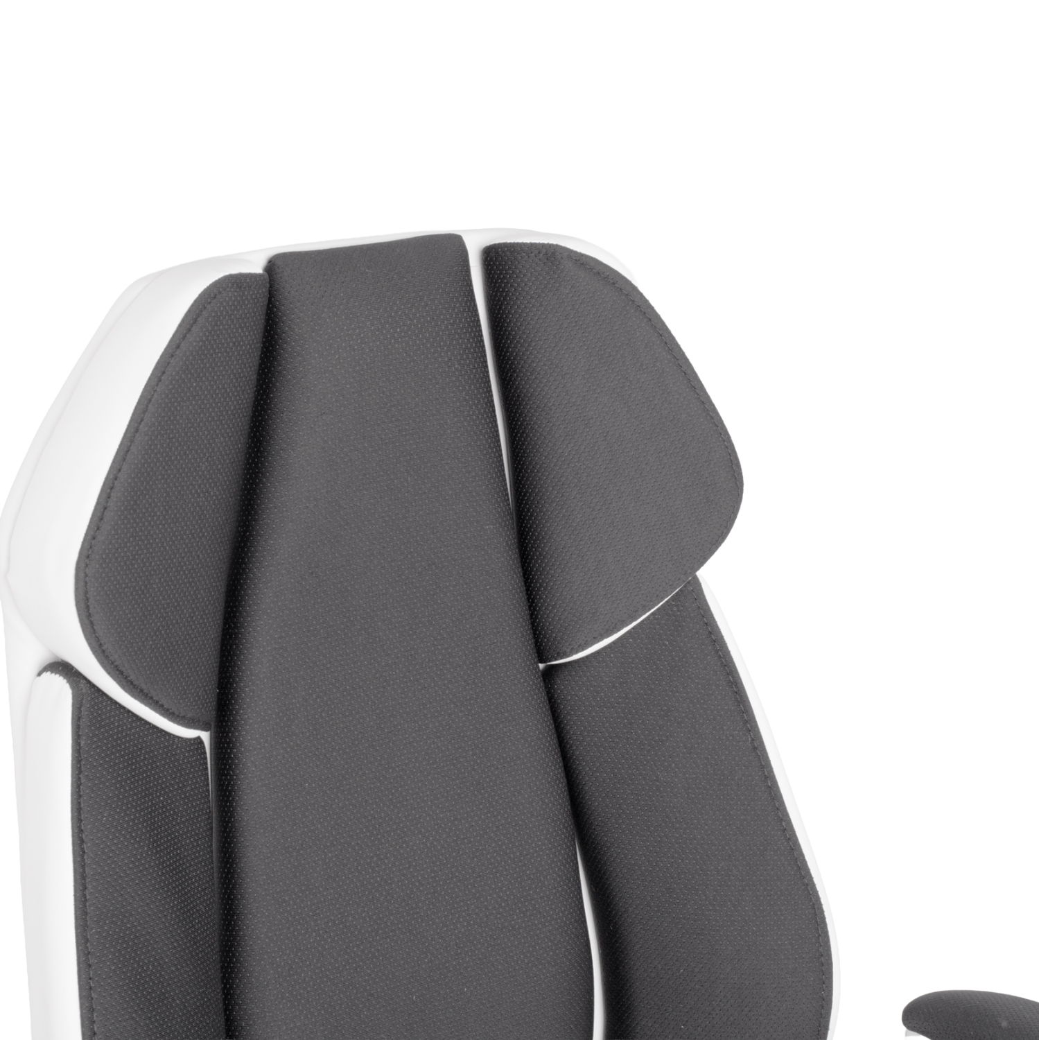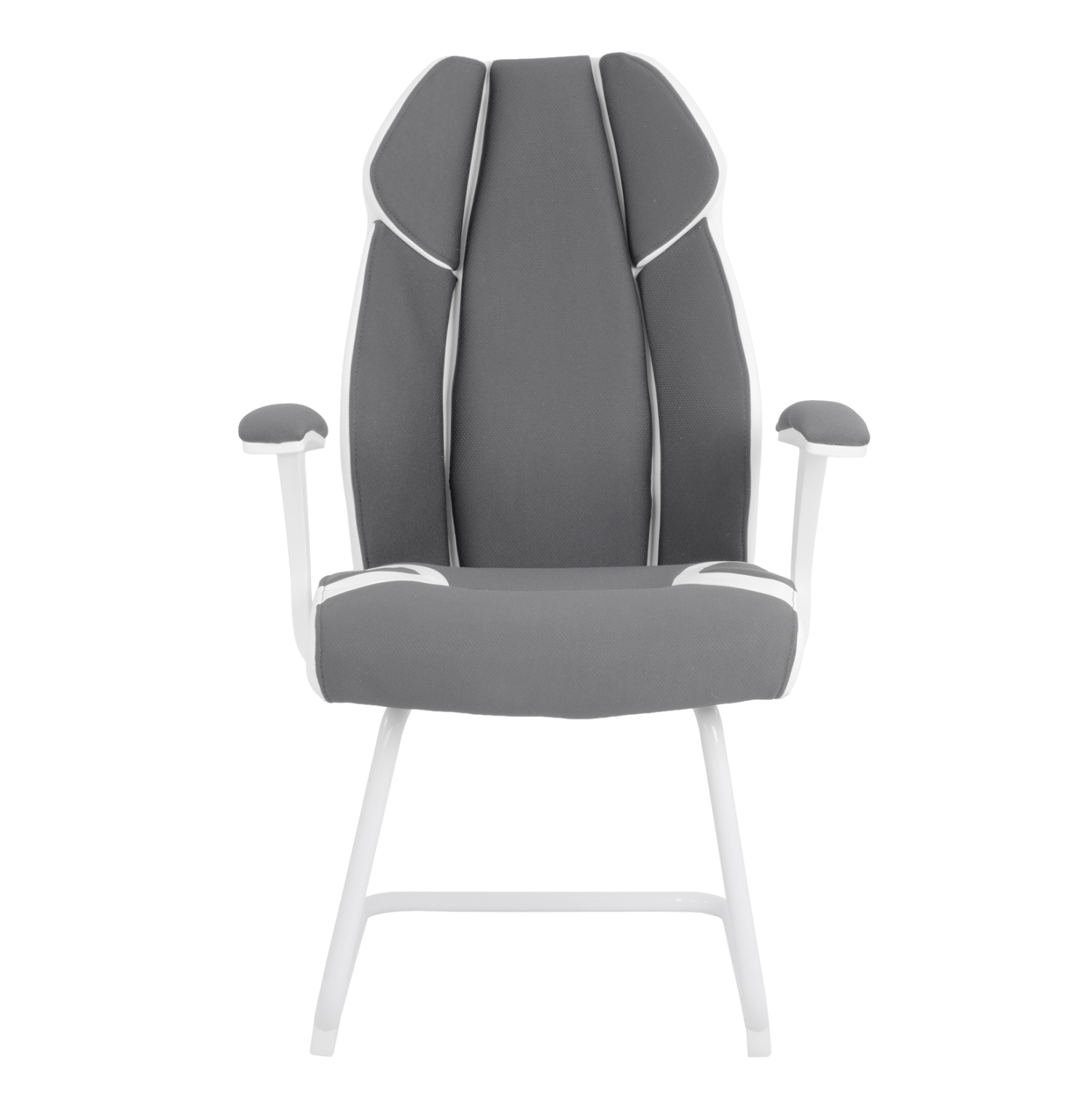 Βάση από αλουμινίο σε λευκή απόχρωση , κάθισμα και πλάτη από ύφασμα μεγάλης αντοχής σε λευκό – γκρι χρώμα και μπράτσα απο πολυπροπυλένιο σε λευκή απόχρωση.