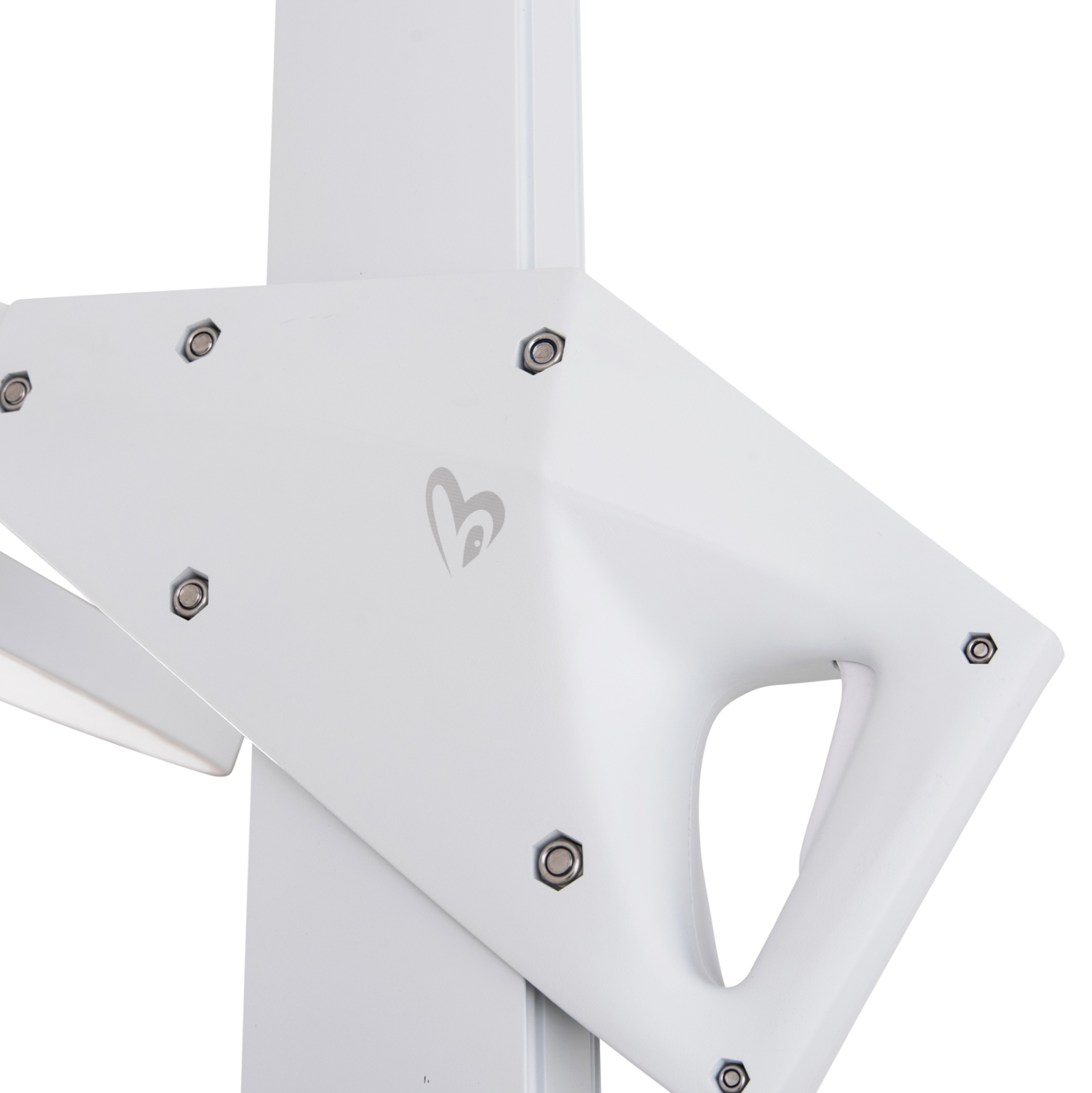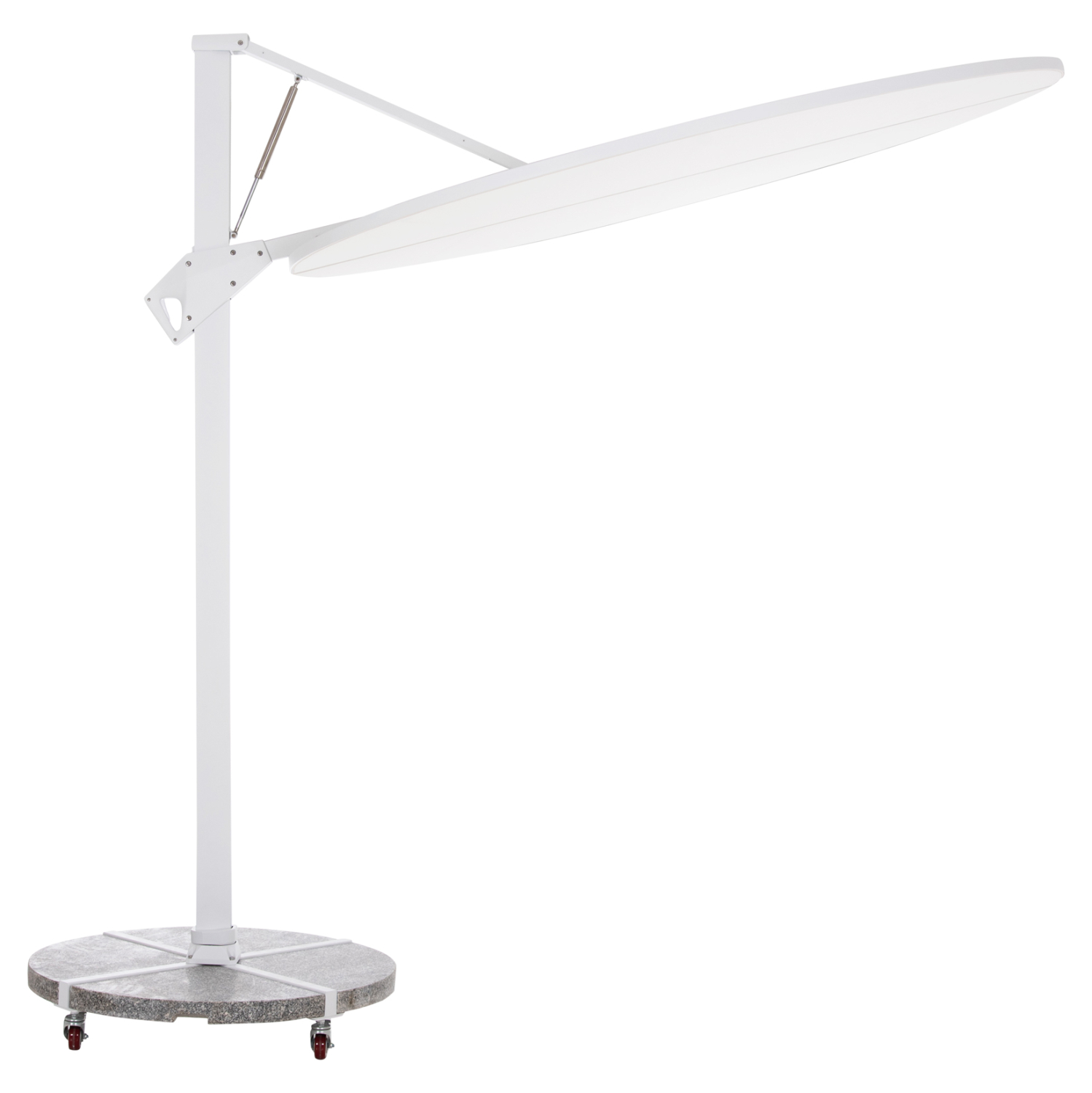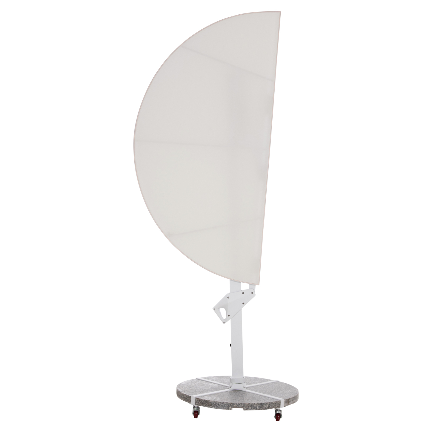 Η βάση των 120kg από φυσικό γρανίτη, χωρισμένη σε τέσσερα τμήματα μέσα σε πλαίσιο τύπου σταυρού, προσφέρει απόλυτη σταθερότητα, ενώ τα γαλβανισμένα χαλύβδινα ροδάκια επιτρέπουν την εύκολη μετακίνηση της ομπρέλας σε οποιοδήποτε σημείο του χώρου. Όλα τα μέρη της είναι βαμμένα σε φωτεινό ΛΕΥΚΟ χρώμα, δημιουργώντας μια σύγχρονη και διακριτική αισθητική.