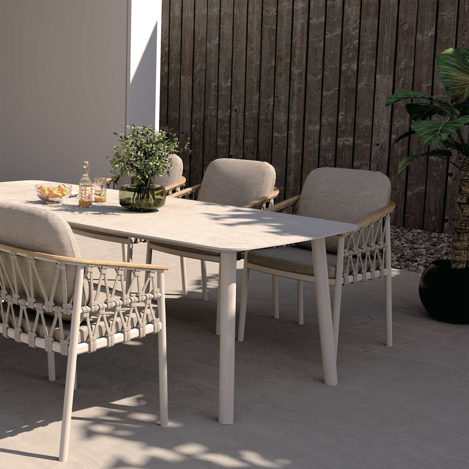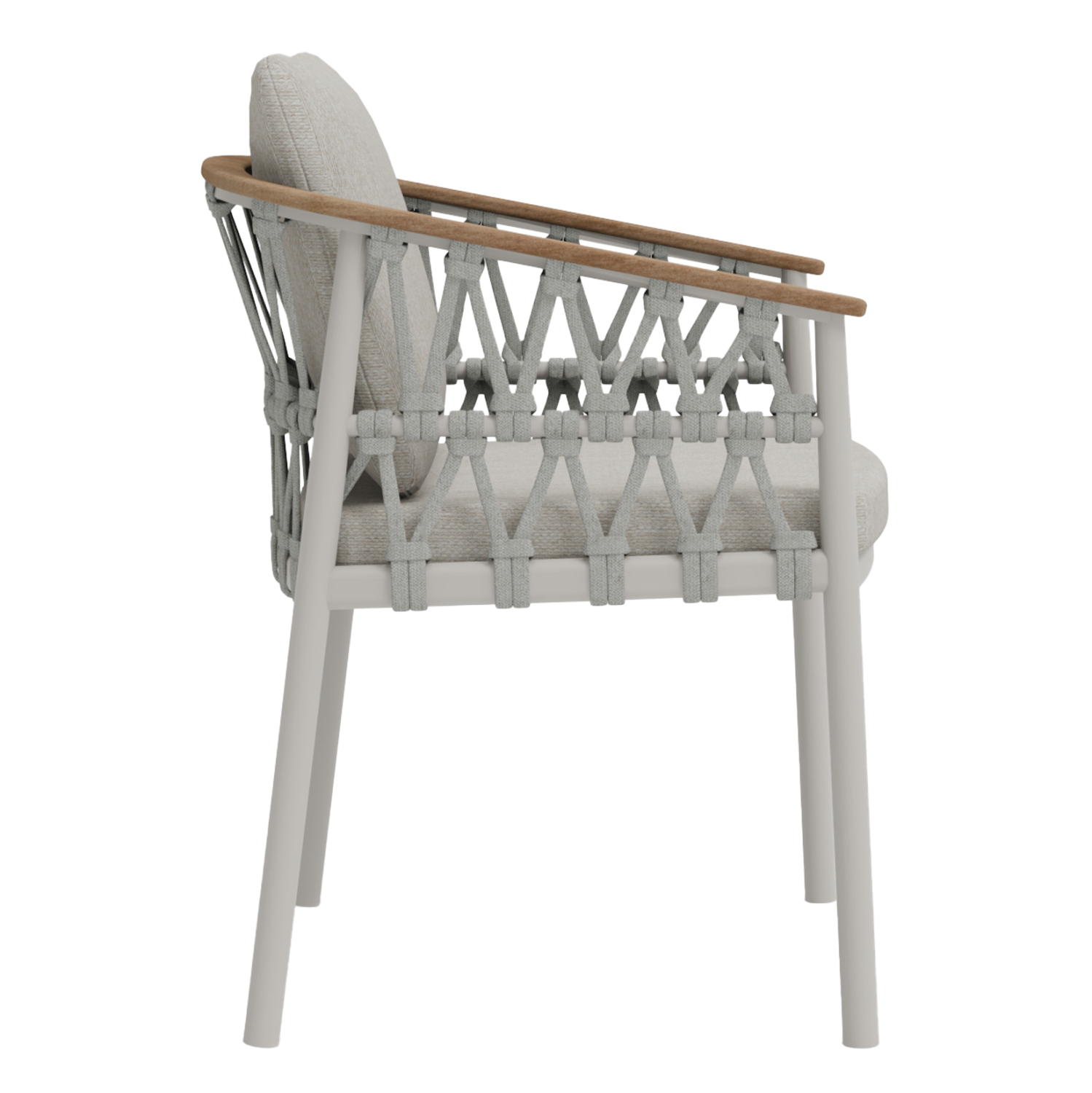 Ο αρμονικός συνδυασμός του αλουμινίου, του strap σχοινιού και του ξύλου teak στα μπράτσα δημιουργεί ένα αποτέλεσμα διακριτικής πολυτέλειας που ταιριάζει σε κάθε μοντέρνο εξωτερικό χώρο.
