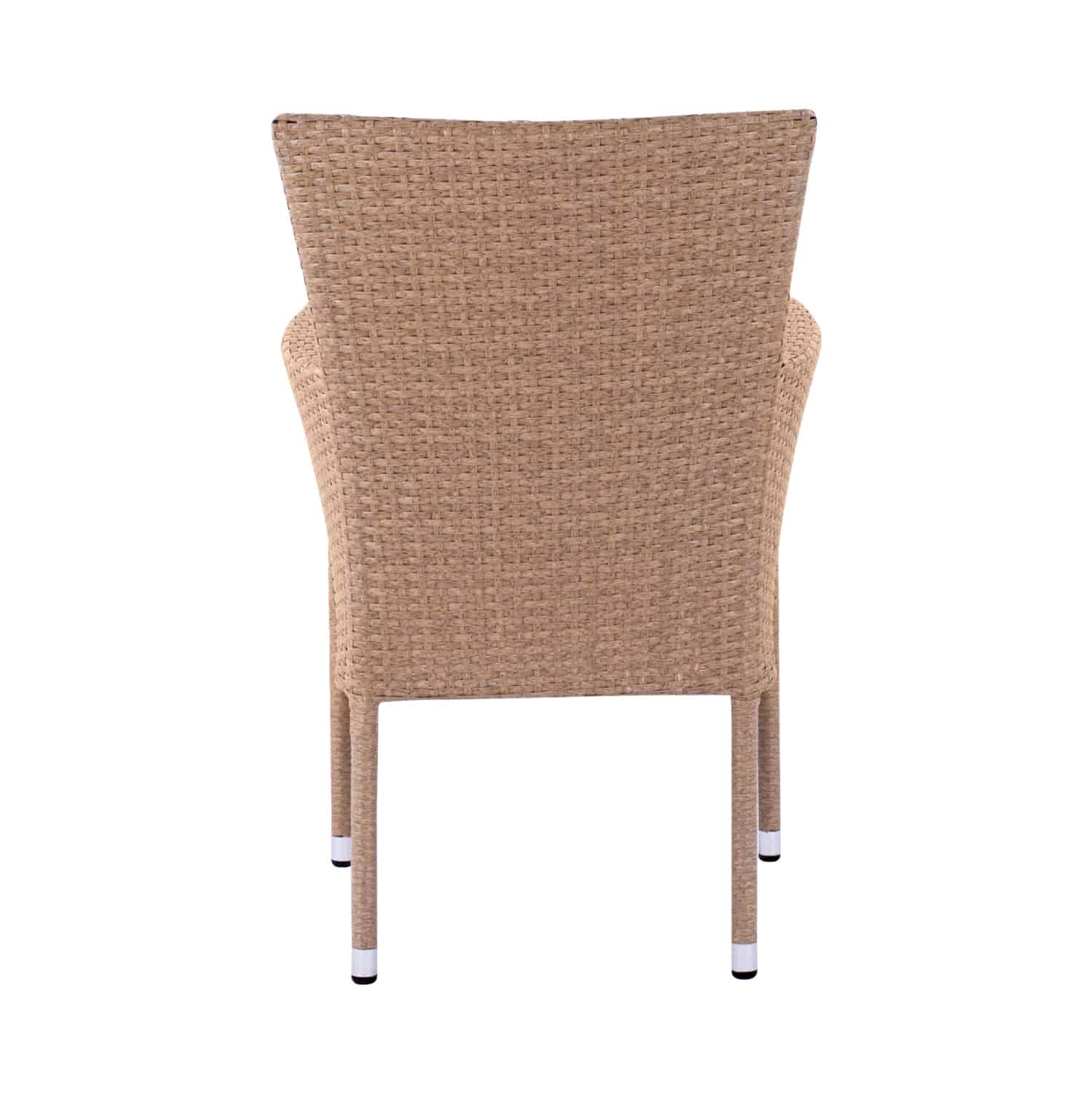 Μοντέρνα πολυθρόνα εξωτερικού χώρου, κατασκευασμένη από μεταλλικό σκελετό και επενδυμένη με πλεκτό wicker σε καφέ-μόκα απόχρωση.