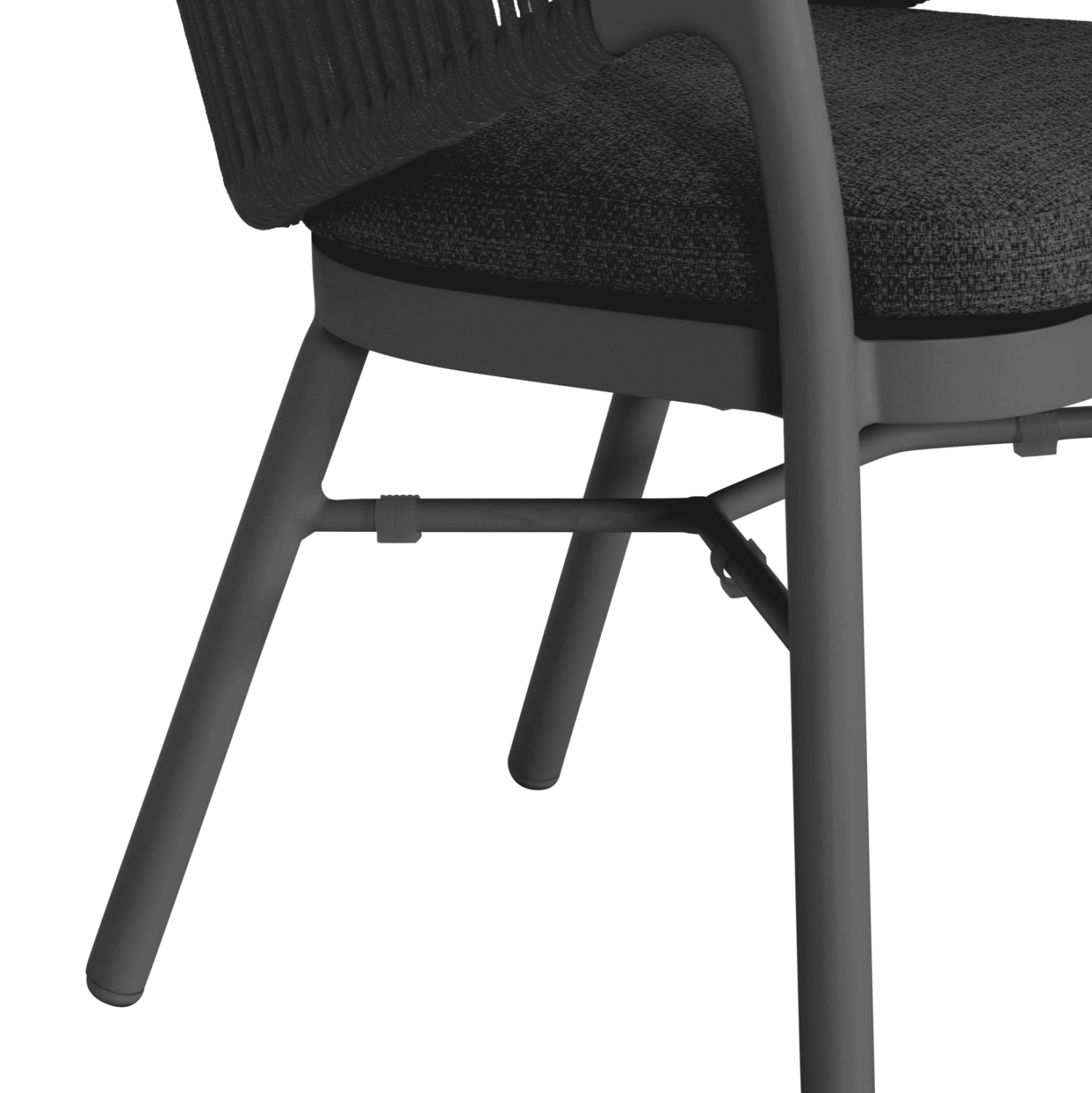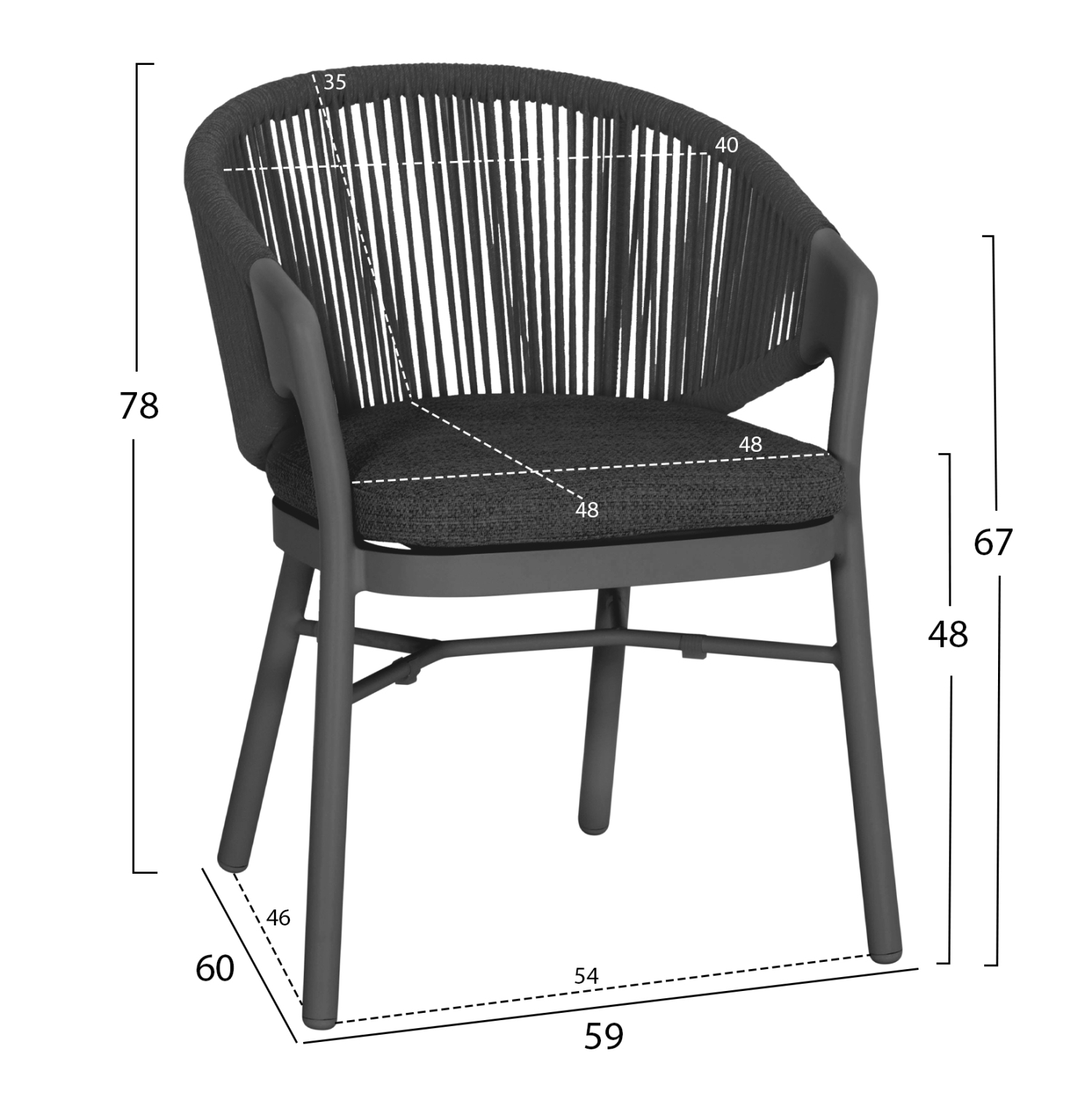 Ο σκελετός είναι κατασκευασμένος από αλουμίνιο βαμμένο με ηλεκτροστατική βαφή (powder coated), που εξασφαλίζει μέγιστη αντοχή στη διάβρωση και τη φθορά. Η πλάτη είναι επενδυμένη με σχοινί από συνθετικό υλικό 6mm, ειδικά σχεδιασμένο για εξωτερική χρήση. Το μαξιλάρι καθίσματος είναι από ύφασμα OLEFIN 360g/m², υλικό που δεν ξεθωριάζει και προσφέρει αντοχή στον ήλιο, το νερό και τη μούχλα.
