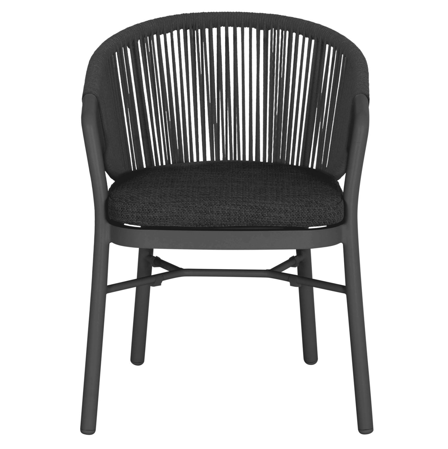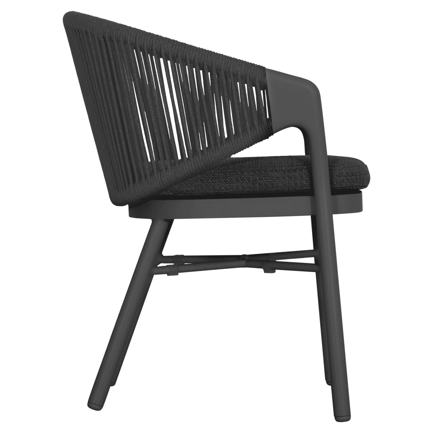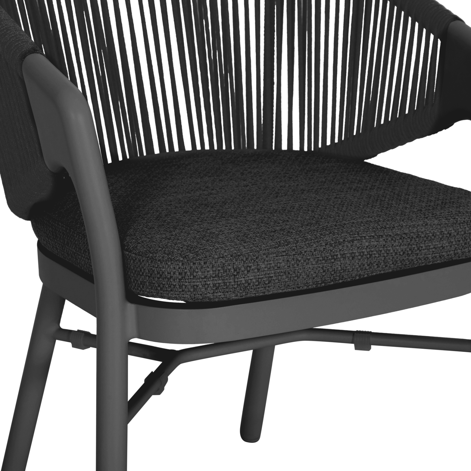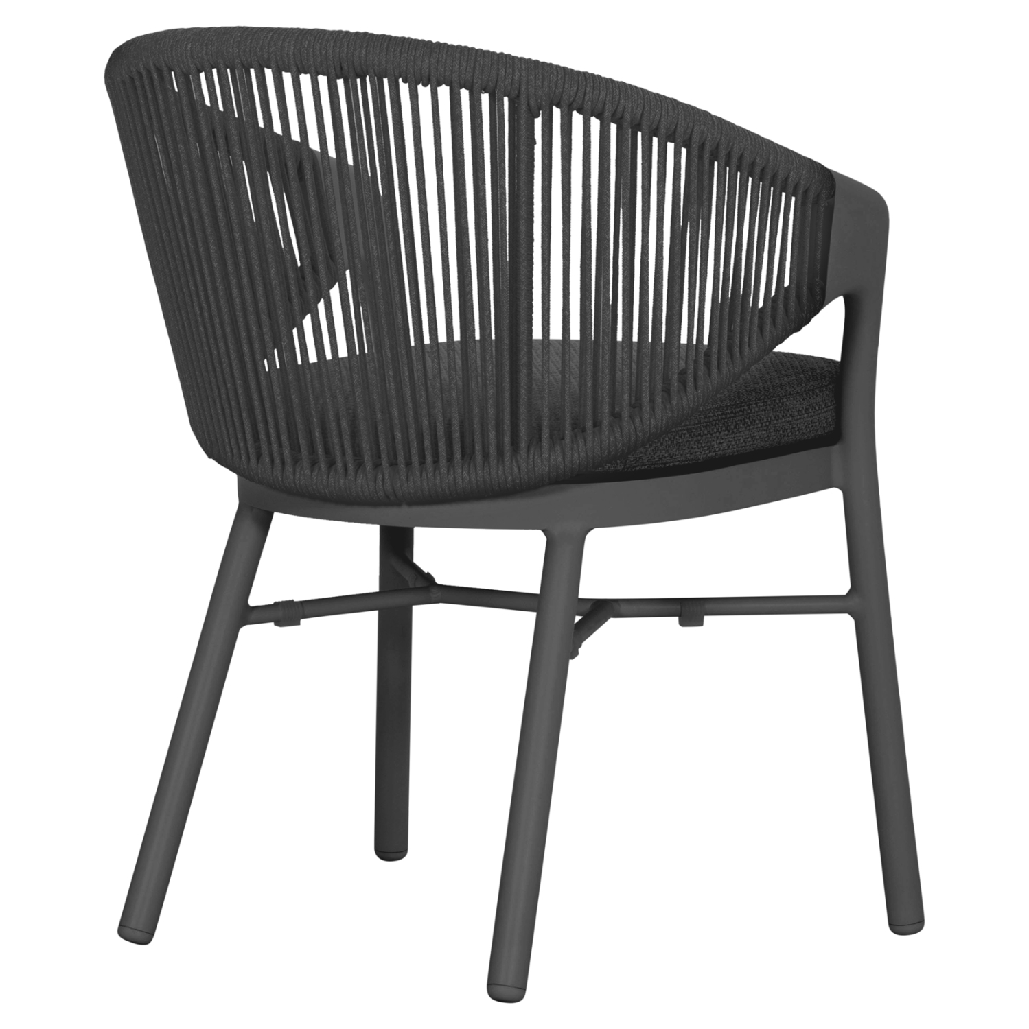 Η πολυθρόνα τραπεζαρίας εξωτερικού χώρου FB96472.01 συνδυάζει άψογα την κομψότητα με τη λειτουργικότητα, αποτελώντας ιδανική επιλογή για βεράντες, αυλές και επαγγελματικούς χώρους φιλοξενίας. Διαθέτει ημικυκλική πλάτη με εντυπωσιακή πλέξη σχοινιού 6mm σε σκούρο γκρι χρώμα, που αγκαλιάζει το σώμα και προσφέρει αναπαυτική στήριξη. Ο σκελετός είναι από αλουμίνιο σε απόχρωση ΣΚΟΥΡΟ ΓΚΡΙ, προσδίδοντας μοντέρνο χαρακτήρα και υψηλή αντοχή στις εξωτερικές συνθήκες. Το μαξιλάρι καθίσματος διαθέτει αφαιρούμενο κάλυμμα από ύφασμα OLEFIN, εξαιρετικά ανθεκτικό στο νερό και στην ηλιακή ακτινοβολία.