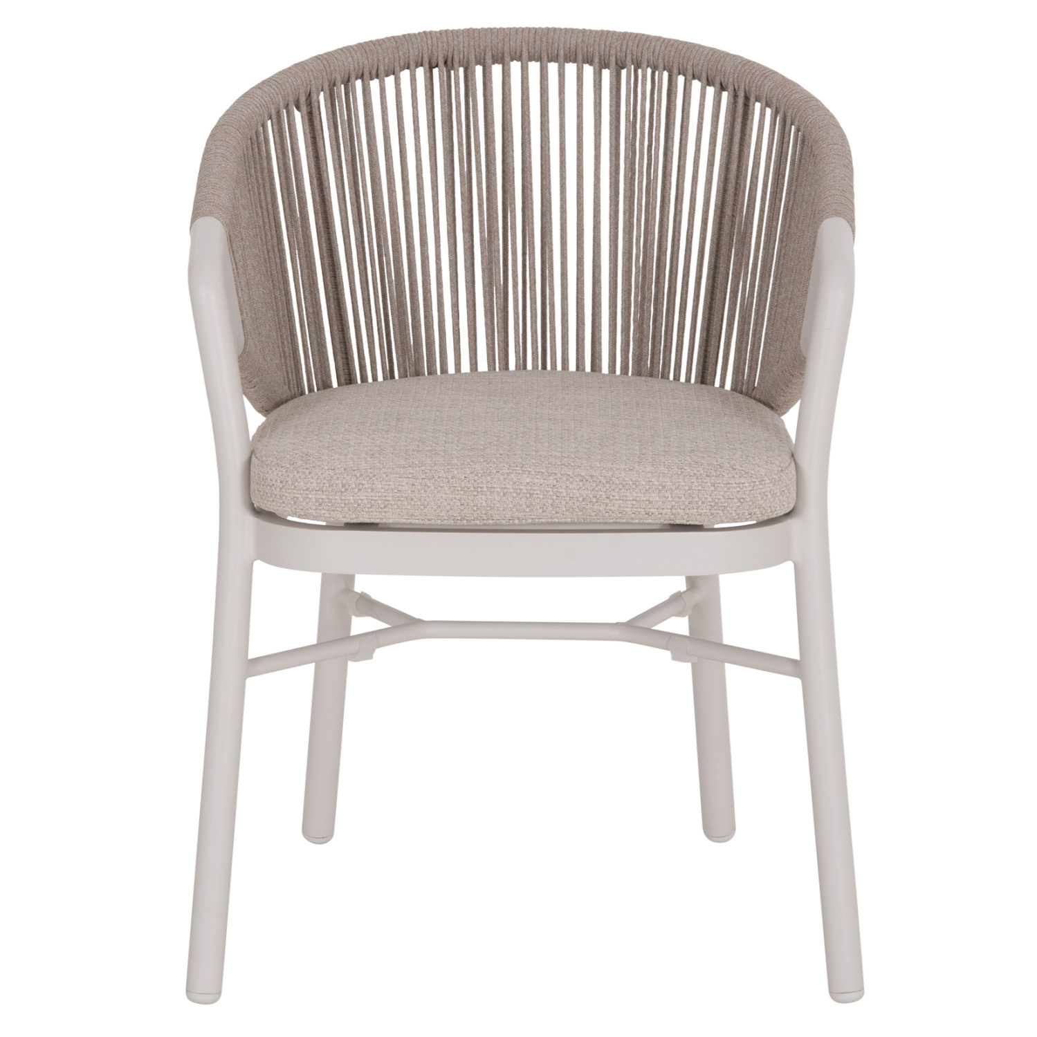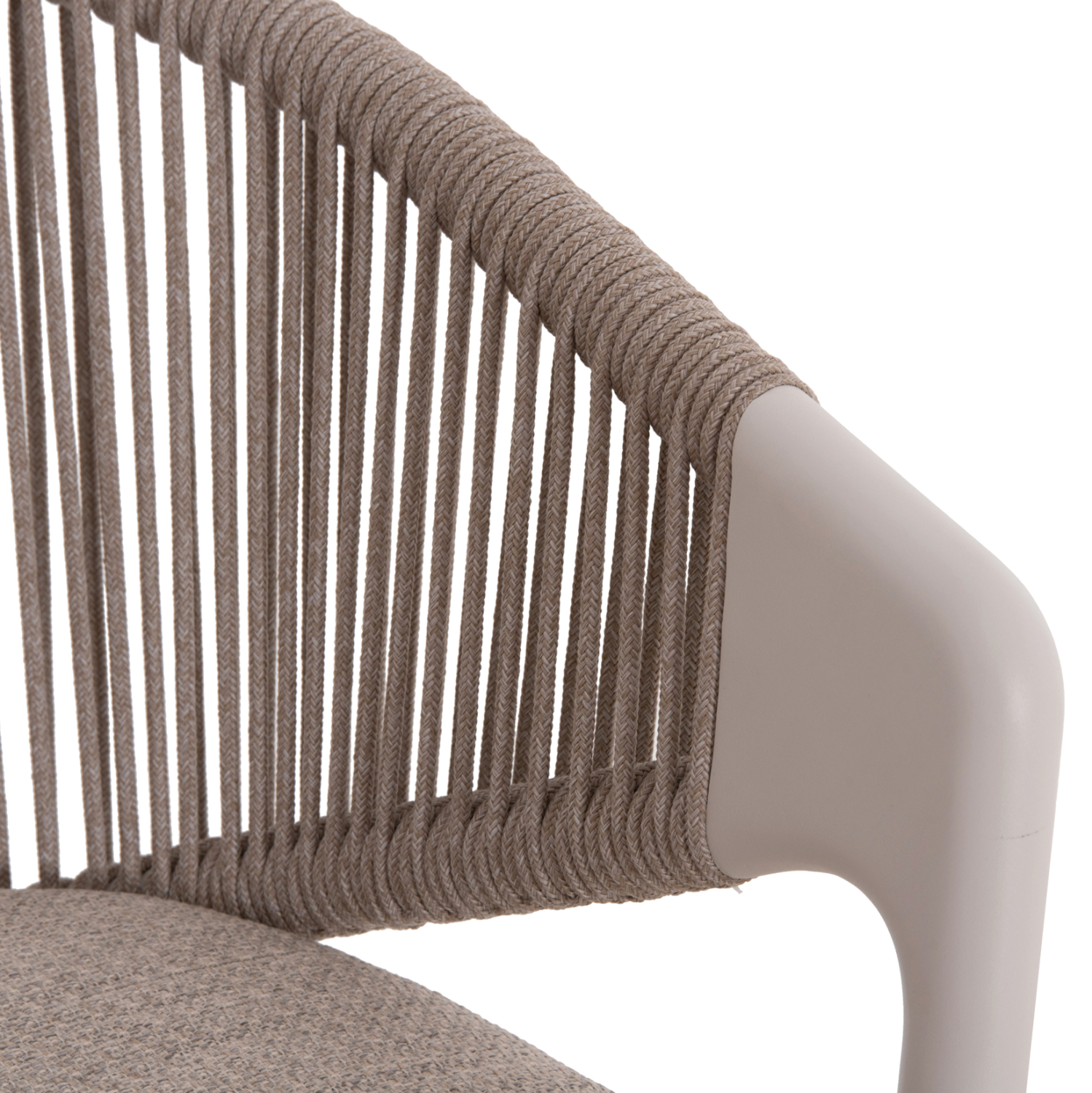 Η πολυθρόνα τραπεζαρίας εξωτερικού χώρου FB96472.02 συνδυάζει άψογα την κομψότητα με τη λειτουργικότητα, αποτελώντας ιδανική επιλογή για βεράντες, αυλές και επαγγελματικούς χώρους φιλοξενίας. Διαθέτει ημικυκλική πλάτη με εντυπωσιακή πλέξη σχοινιού 6mm σε ΑΝΟΙΧΤΟ ΓΚΡΙ χρώμα, που αγκαλιάζει το σώμα και προσφέρει αναπαυτική στήριξη. Ο σκελετός είναι από αλουμίνιο σε ΛΕΥΚΗ απόχρωση, προσδίδοντας μοντέρνο χαρακτήρα και υψηλή αντοχή στις εξωτερικές συνθήκες. Το μαξιλάρι καθίσματος διαθέτει αφαιρούμενο κάλυμμα από ύφασμα OLEFIN σε ΑΝΟΙΧΤΟ ΓΚΡΙ, εξαιρετικά ανθεκτικό στο νερό και στην ηλιακή ακτινοβολία.