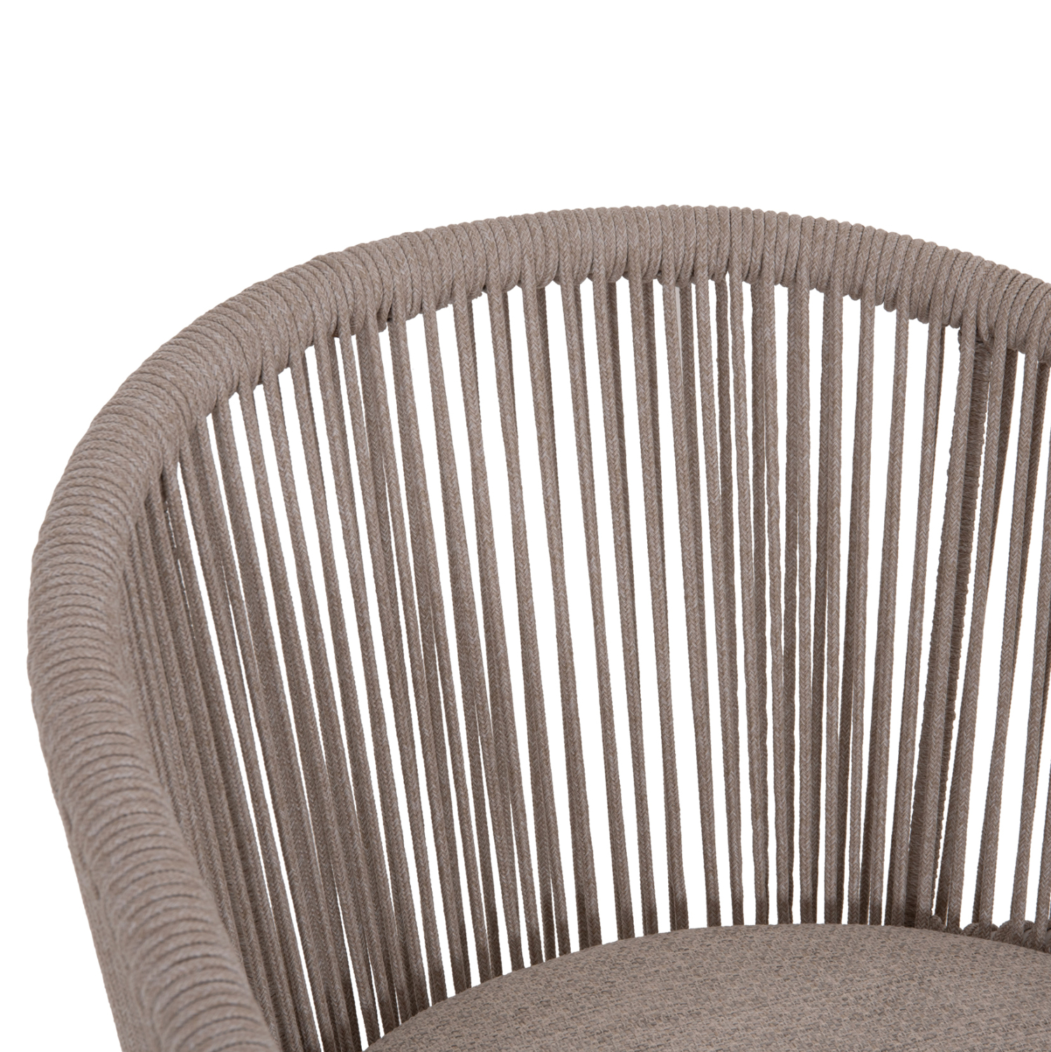 Ο σκελετός είναι κατασκευασμένος από αλουμίνιο βαμμένο με ηλεκτροστατική βαφή (powder coated), που εξασφαλίζει μέγιστη αντοχή στη διάβρωση και τη φθορά. Η πλάτη είναι επενδυμένη με σχοινί από συνθετικό υλικό 6mm, ειδικά σχεδιασμένο για εξωτερική χρήση. Το μαξιλάρι καθίσματος είναι από ύφασμα OLEFIN 360g/m², υλικό που δεν ξεθωριάζει και προσφέρει αντοχή στον ήλιο, το νερό και τη μούχλα.