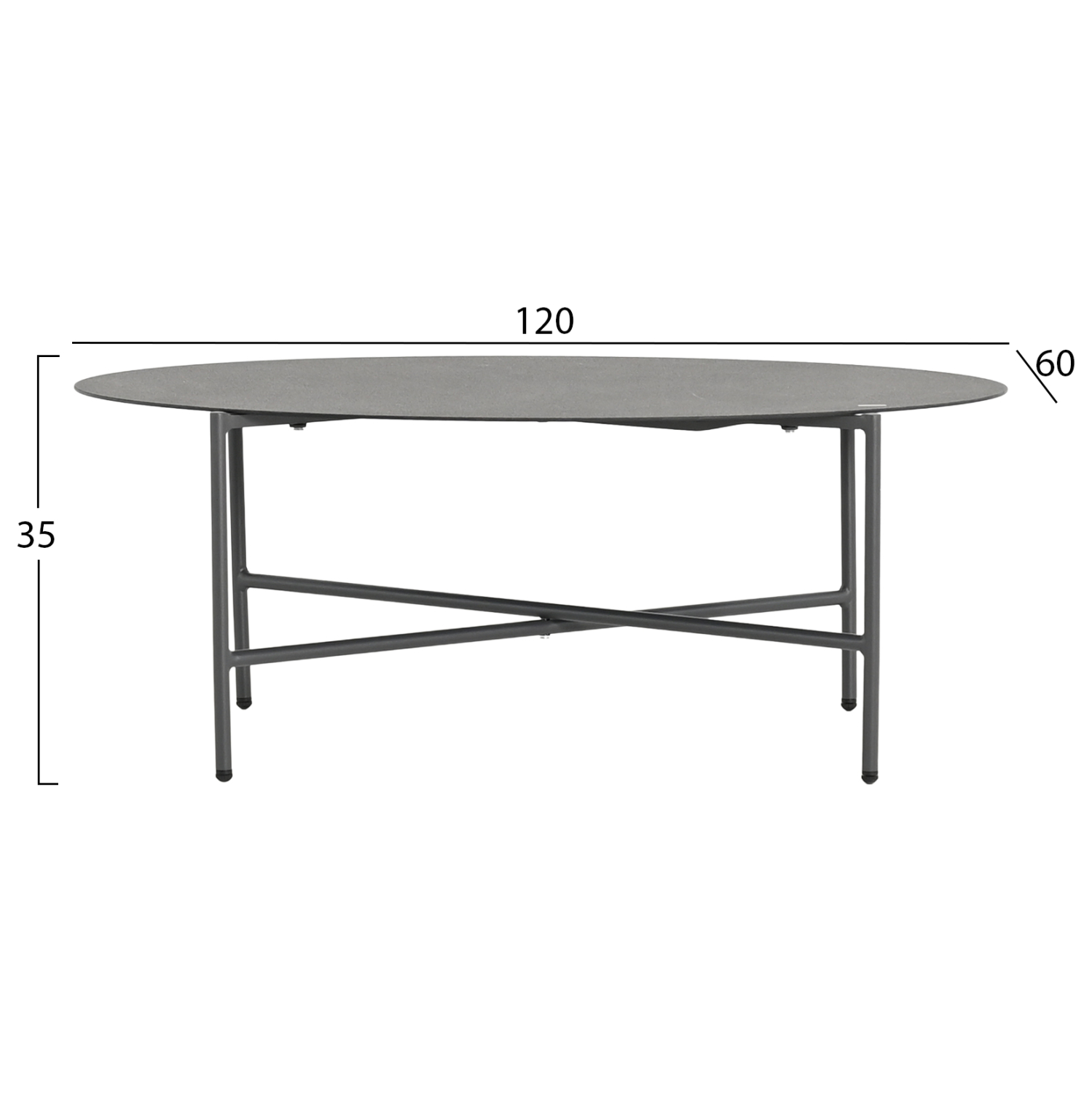 Το ορθογώνιο τραπεζάκι μέσης διαθέτει σκελετό από αλουμίνιο και επιφάνεια από sandblasted stone με γυαλί, προσθέτοντας εμφανή πολυτέλεια και ευκολία στον καθαρισμό.