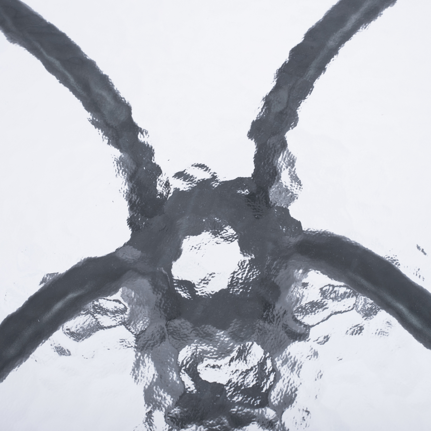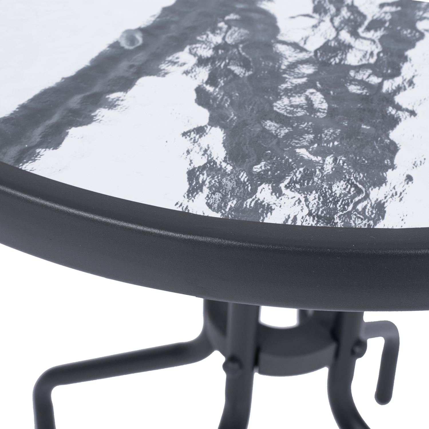 Ένα τραπέζι μεταλλικό εξωτερικού χώρου σε χρώμα γκρι-ανθρακί, με ενσωματωμένο τζαμί ασφάλειας (secure).