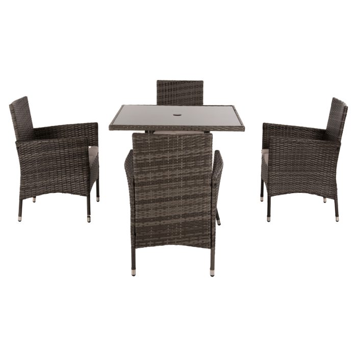 Το τραπέζι είναι τετράγωνο, με διακόσμηση από καφέ συνθετικό Rattan επίσης, ενώ η γυάλινη επιφάνεια διαθέτει στο κέντρο της τρύπα για ομπρέλα η οποία στηρίζεται και σε υποδοχή στον μεταλλικό σκελετό του τραπεζιού.