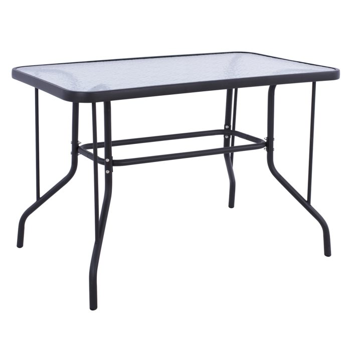 Το τραπέζι FB95020.01 εξωτερικού χώρου έχει ΣΚΟΥΡΟ ΓΚΡΙ μεταλλικό σκελετό και γυάλινη θολή επιφάνεια! Πρόκειται για πολύ δημοφιλές τραπέζι που δεν λείπει σχεδόν από κανέναν μπαλκόνι ή κήπο. Το FB95020.01 είναι ορθογώνιο με γωνίες στρογγυλεμένες ενώ το γυαλί της επιφάνειας είναι ενισχυμένο.