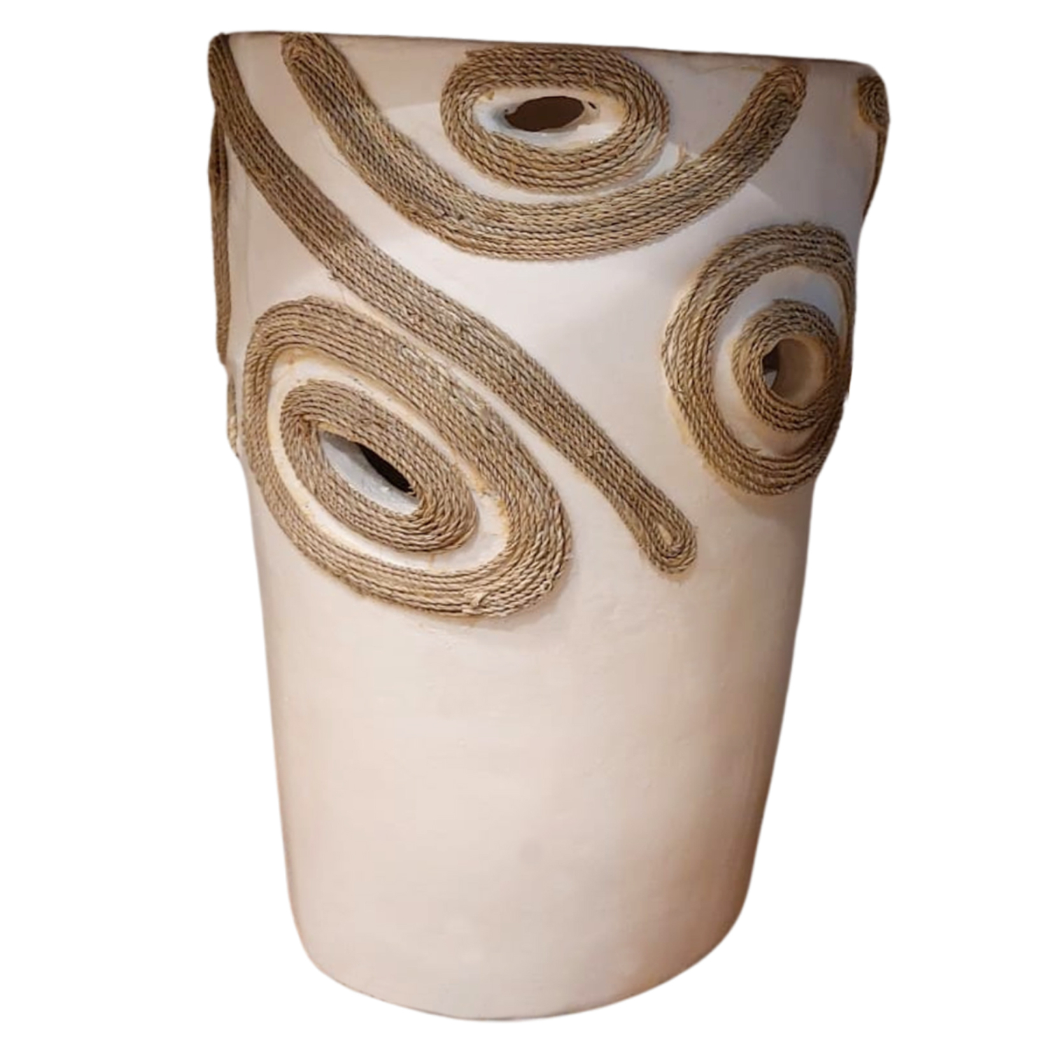 Το επιτραπέζιο χειροποίητο διακοσμητικό βάζο FB94677.02L είναι λιτό σε κλασσικό σχέδιο. Είναι κατασκευασμένο εξολοκλήρου από τερακότα σε ΚΡΕΜ χρώμα ενώ διαθέτει διακοσμητικά σχέδια με σχοινί από ίνες φοίνικα κολλημένο στις πλευρές του βάζου. Ιδανικό για πληθώρα χώρων, τόσο για το σπίτι, όσο και για επαγγελματικούς χώρους.