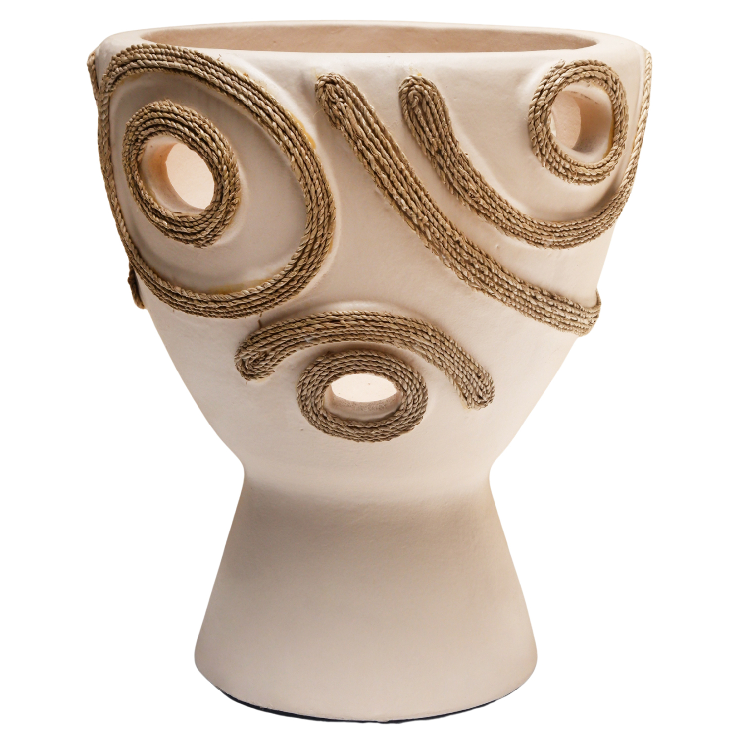 Το επιτραπέζιο χειροποίητο διακοσμητικό βάζο FB94678.02 έχει το σχήμα μεγάλου κυπέλλου. Είναι κατασκευασμένο εξολοκλήρου από τερακότα σε ΚΡΕΜ χρώμα ενώ διαθέτει διακοσμητικά σχέδια με σχοινί από ίνες φοίνικα στις πλευρές του βάζου. Ιδανικό για πληθώρα χώρων, τόσο για το σπίτι, όσο και για επαγγελματικούς χώρους.
