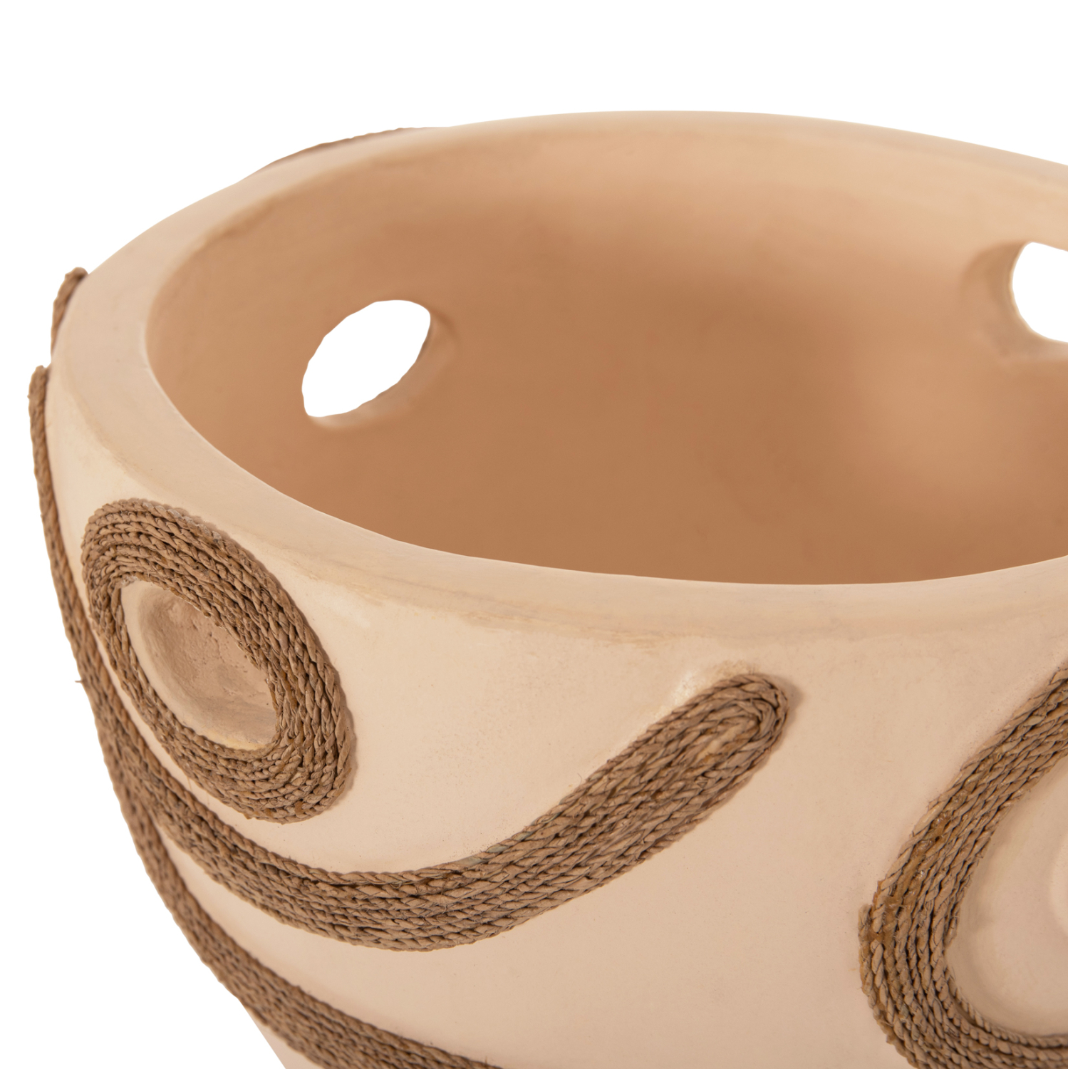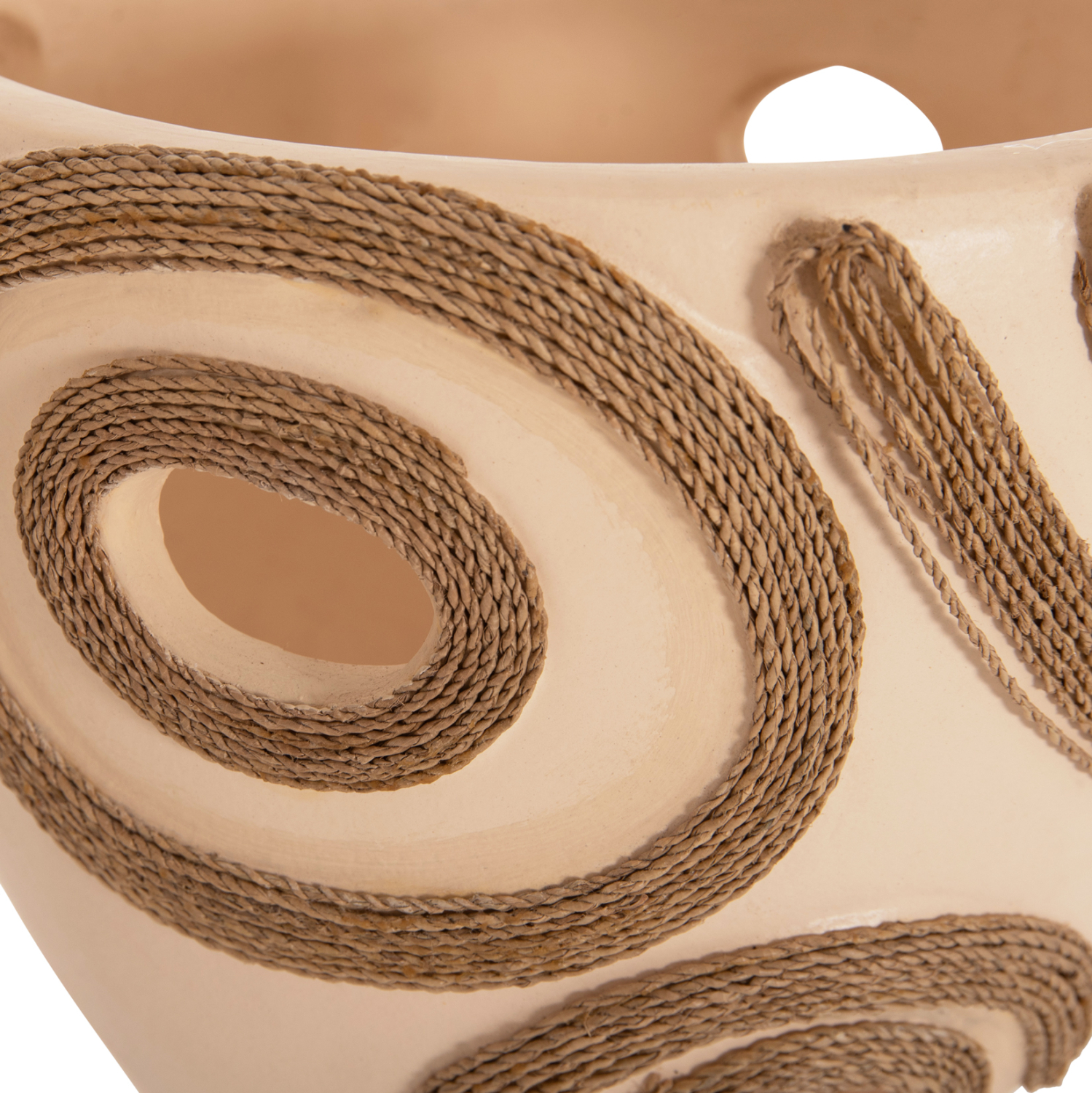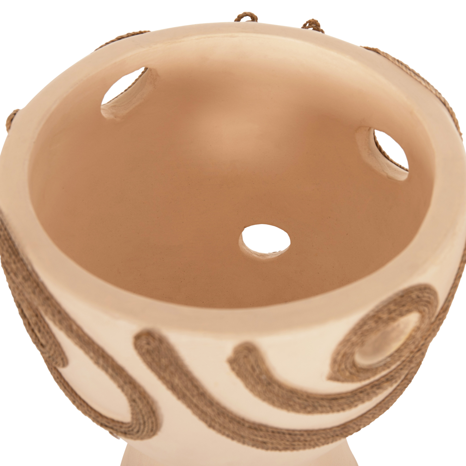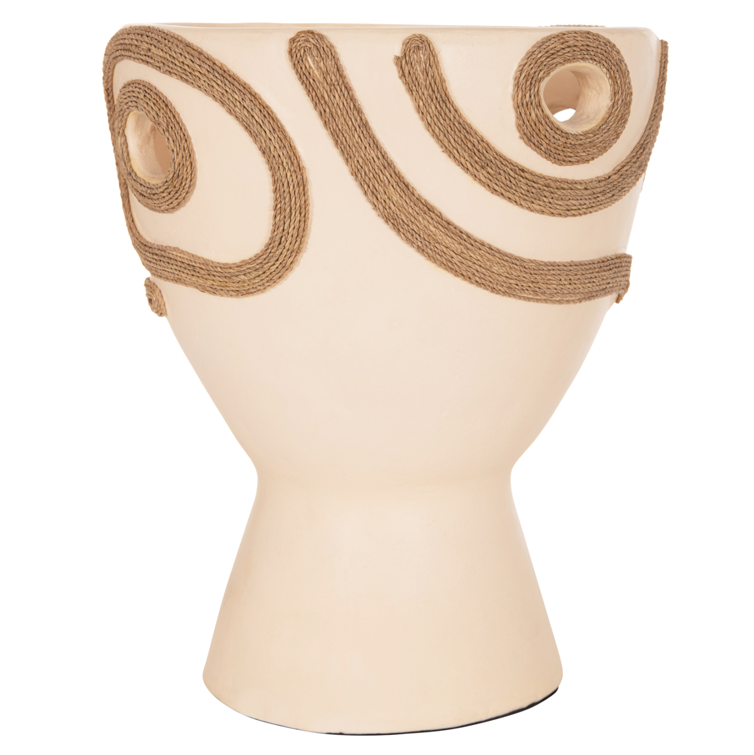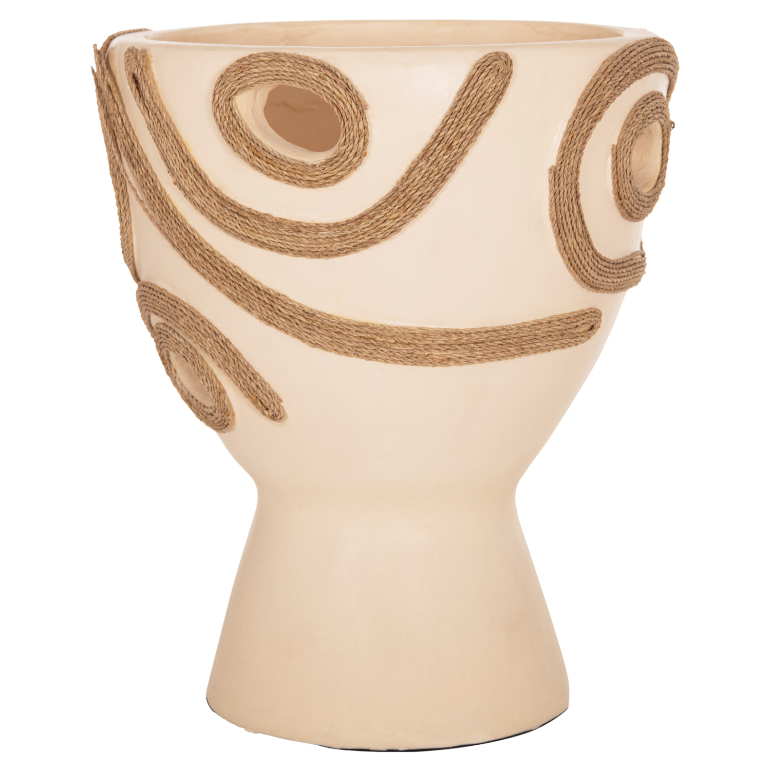 Το επιτραπέζιο χειροποίητο διακοσμητικό βάζο FB94678.02 έχει το σχήμα μεγάλου κυπέλλου. Είναι κατασκευασμένο εξολοκλήρου από τερακότα σε ΚΡΕΜ χρώμα ενώ διαθέτει διακοσμητικά σχέδια με σχοινί από ίνες φοίνικα στις πλευρές του βάζου. Ιδανικό για πληθώρα χώρων, τόσο για το σπίτι, όσο και για επαγγελματικούς χώρους.