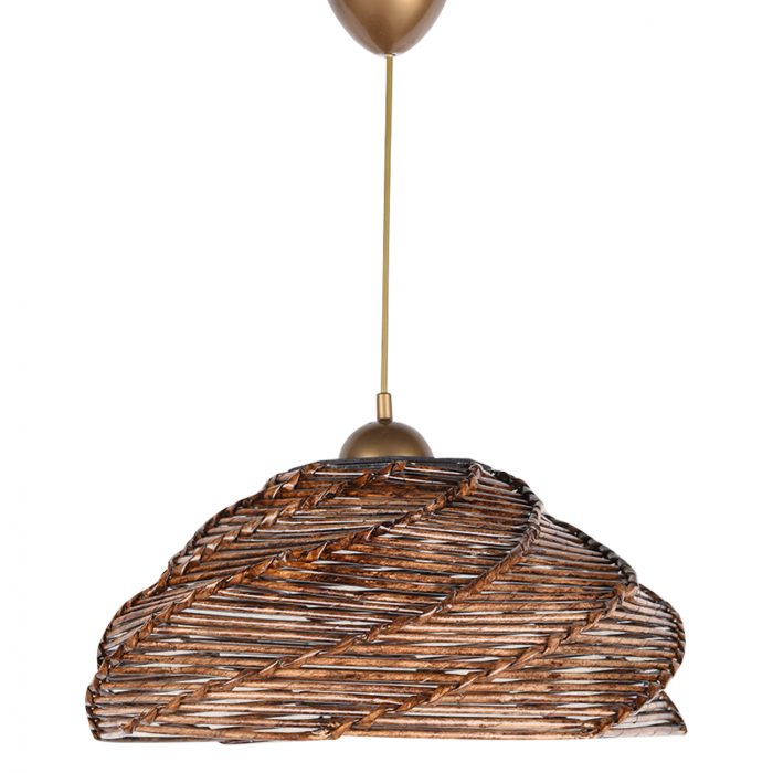Μοντέρνο κρεμαστό φωτιστικό οροφής, κατασκευασμένο από ξύλινο σκελετό και επενδυμένο από bamboo υλικό σε καρυδί απόχρωση.