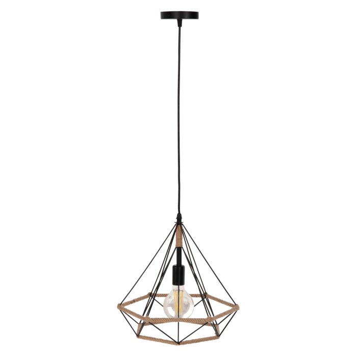Αφήστε το φως να απλωθεί στον χώρο με ένα πρωτότυπο και φινετσάτο κρεμαστό μονόφωτο οροφής, ολοκληρώνοντας την διακόσμησή σας. Το σχήμα διαμαντιού με ΜΑΥΡΕΣ μεταλλικές ράβδους και σχοινί, είναι η επιτομή του μοντέρνου design.