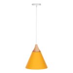 Ανακαλύψτε αυτό το νέο μας κρεμαστό φωτιστικό οροφής και ολοκληρώστε την διακόσμησή σας. Πρόκειται για ένα φωτιστικό με ΚΙΤΡΙΝΗ μεταλλικό καπέλο σε σχήμα καμπάνας με λεπτομέρεια ξύλου στην κορυφή του φωτιστικού. Αισθητικά, ολοκληρώνεται με το λευκό καλώδιο κρέμασης και την λευκή βάση οροφής, και αποτελεί την τελευταία τάση στα φωτιστικά οροφής.