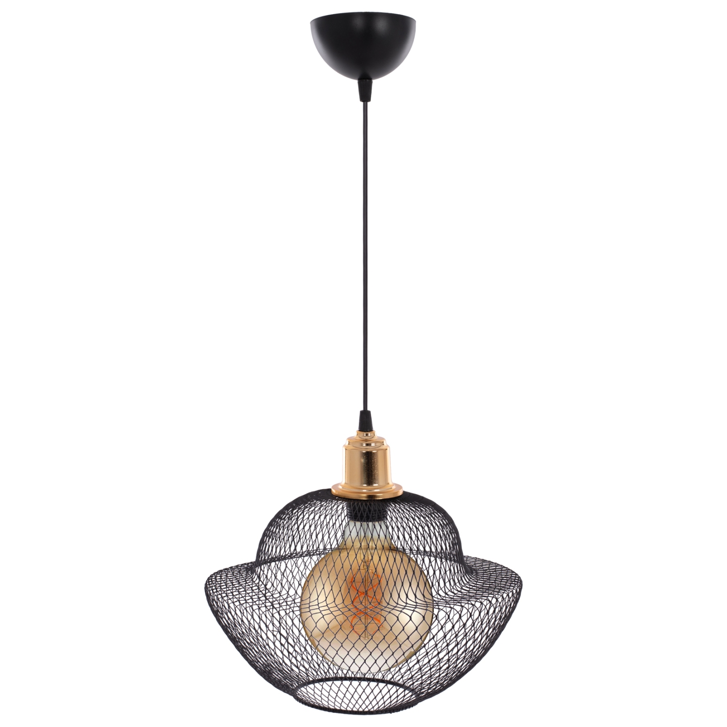 FB97690.01-κρεμαστό —-Αφήστε το φως να απλωθεί στον χώρο με ένα πρωτότυπο και φινετσάτο μονόφωτο οροφής, ολοκληρώνοντας την διακόσμησή σας. Το «καπέλο» του φωτιστικού αποτελείται από ένα πυκνό μεταλλικό πλέγμα σε μοντέρνο και ιδιαίτερο σχήμα και είναι η επιτομή του μοντέρνου design. Η διαφορετική «πινελιά» αυτού του κρεμαστού μονόφωτου είναι το χρυσό ντουί του λαμπτήρα το οποίο είναι λουστραρισμένο δίνοντας μια αίσθηση πολυτέλειας.