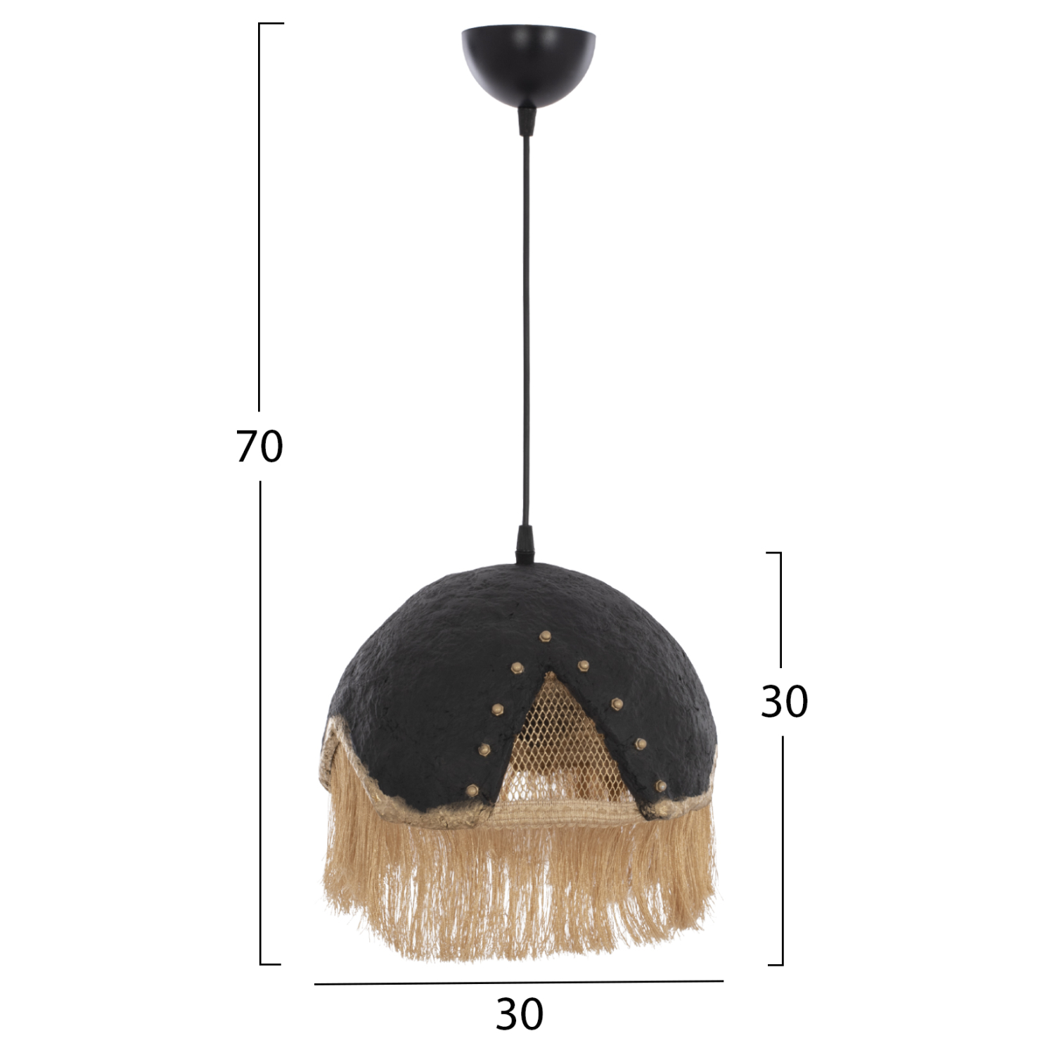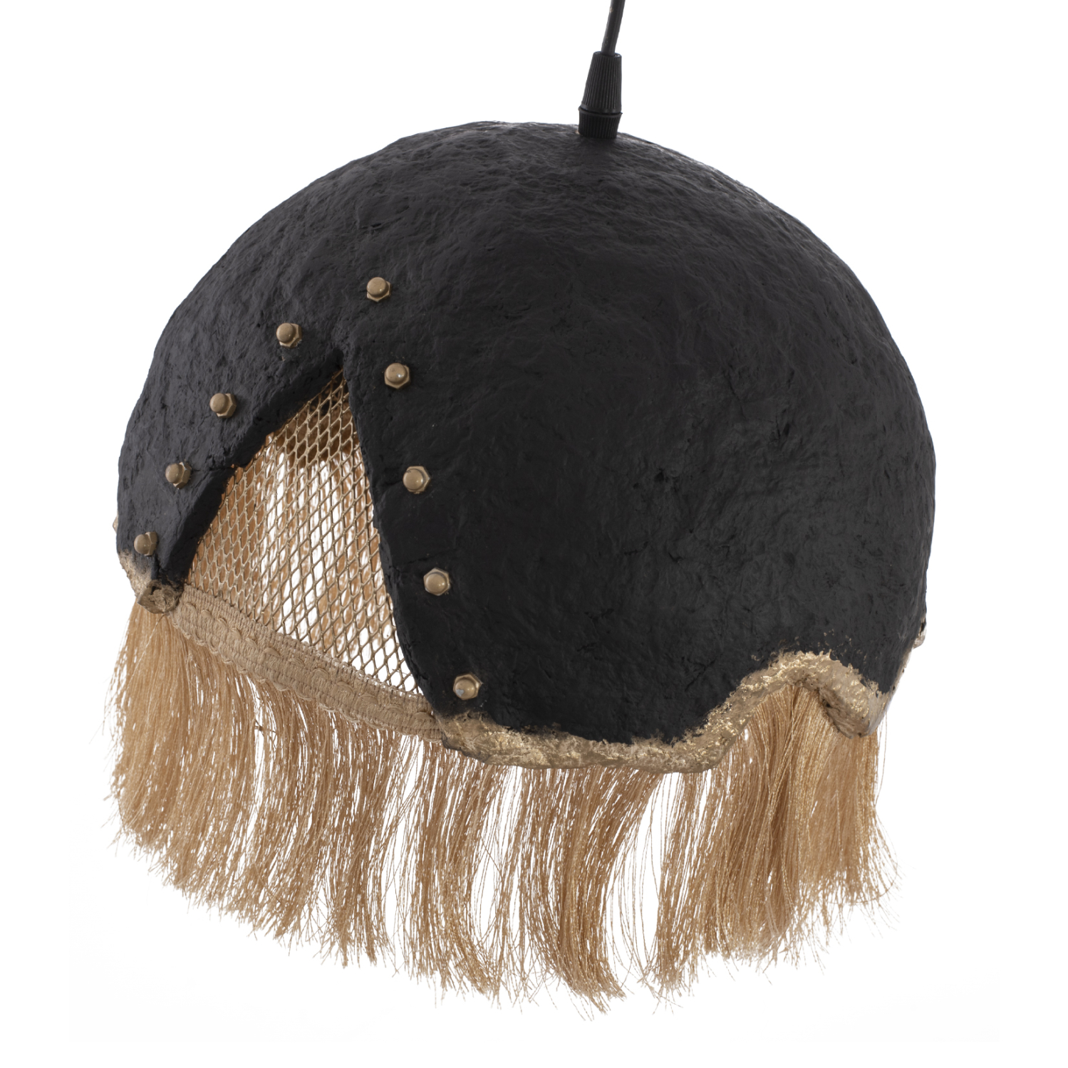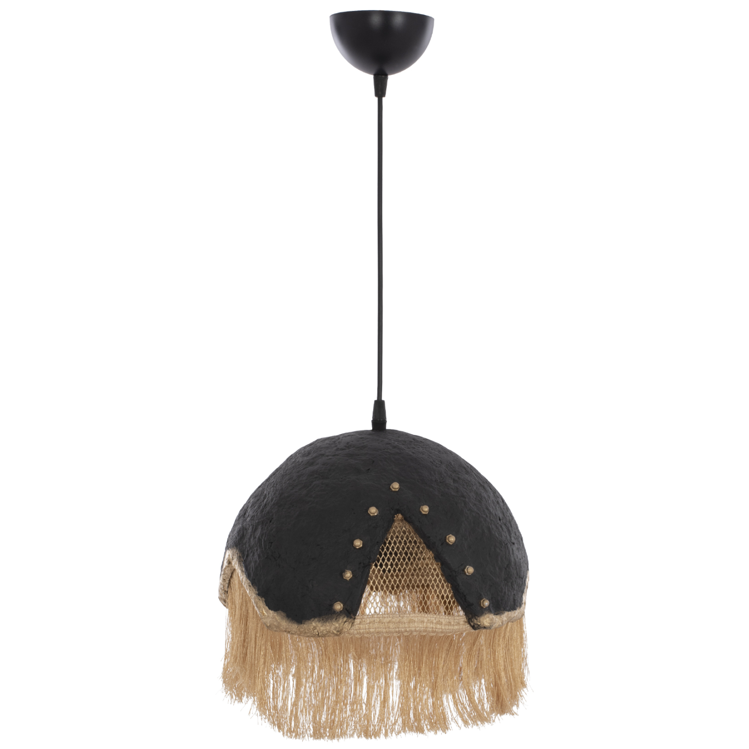 FB97693.01-κρεμαστό φωτιστικό —-Αφήστε το φως να απλωθεί στον χώρο με ένα πρωτότυπο μονόφωτο οροφής, ολοκληρώνοντας την διακόσμησή σας. Το «καπέλο» του φωτιστικού αποτελείται από ένα σφαιρικό κομμάτι σε ιδιαίτερο ημισφαιρικό σχήμα και είναι η επιτομή του μοντέρνου design. Η διαφορετική «πινελιά» αυτού του κρεμαστού μονόφωτου είναι το χρυσό μεταλλικό πλέγμα στο εσωτερικό μέρος και τα μπεζ κρόσια που ολοκληρώνουν αισθητικά αυτό το πολύ ιδιαίτερο φωτιστικό.